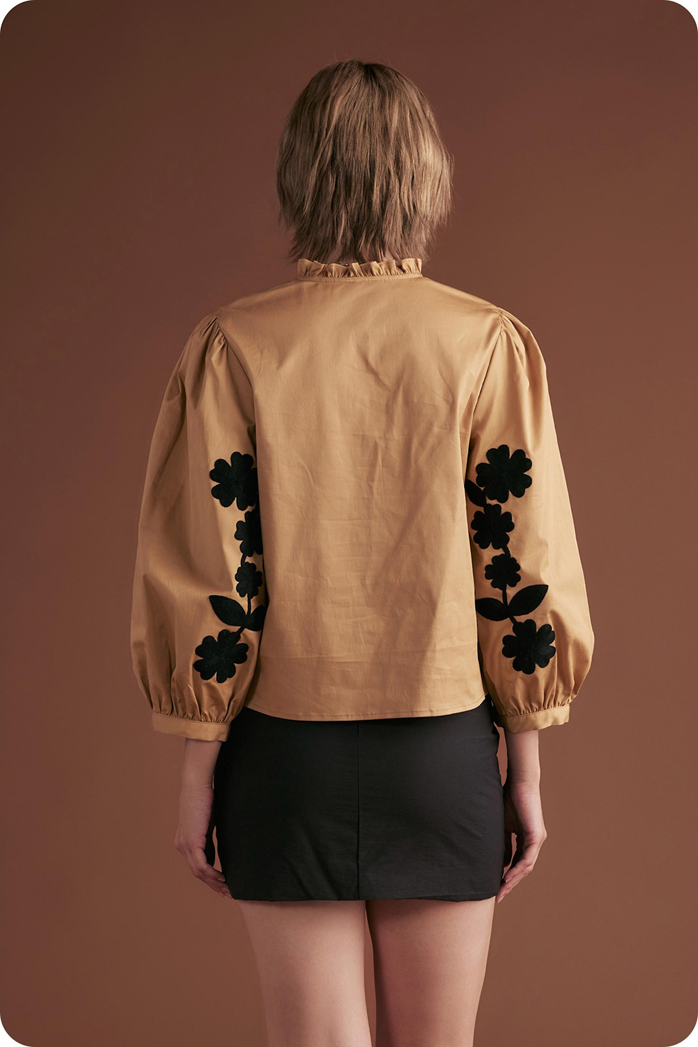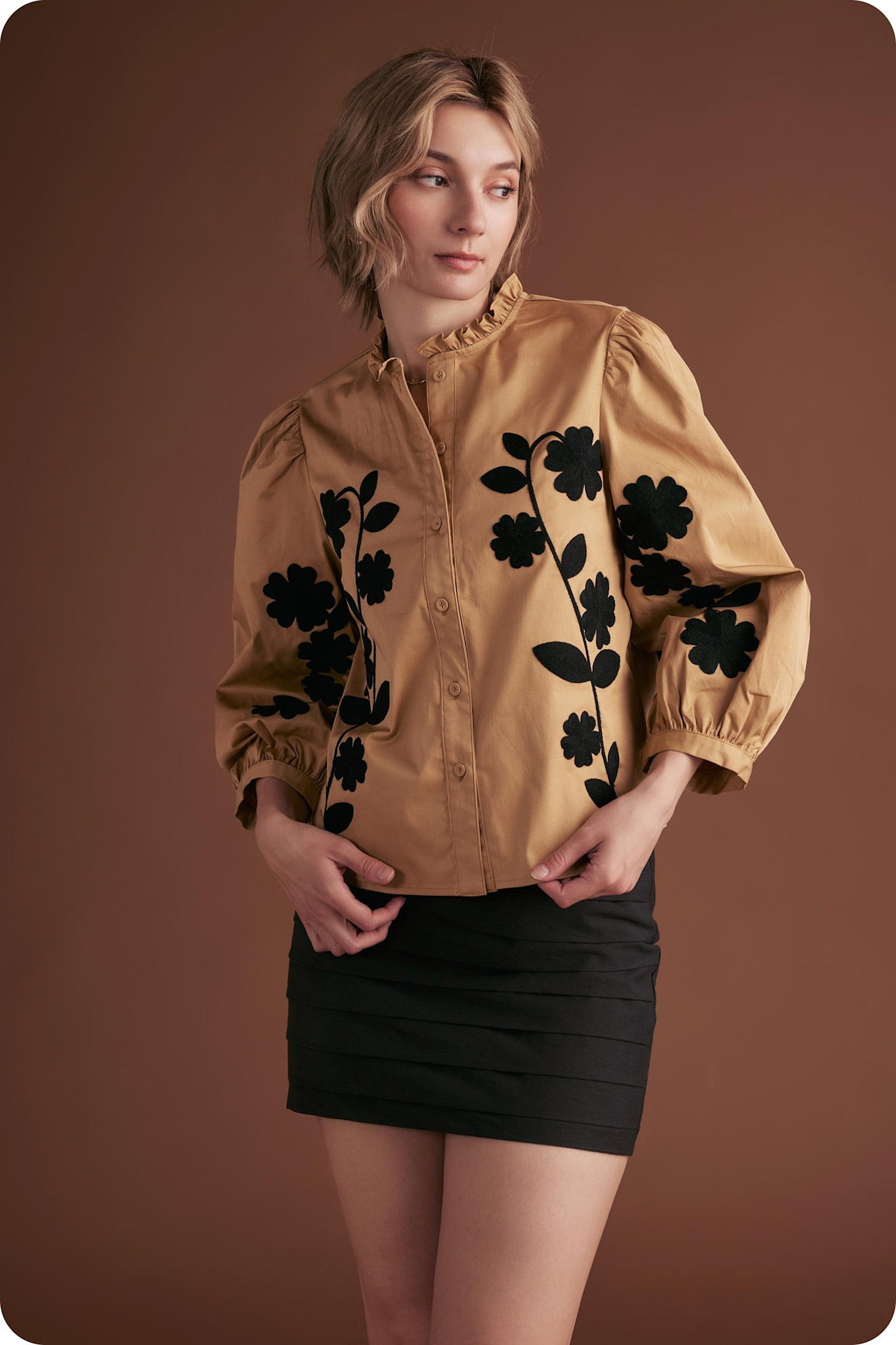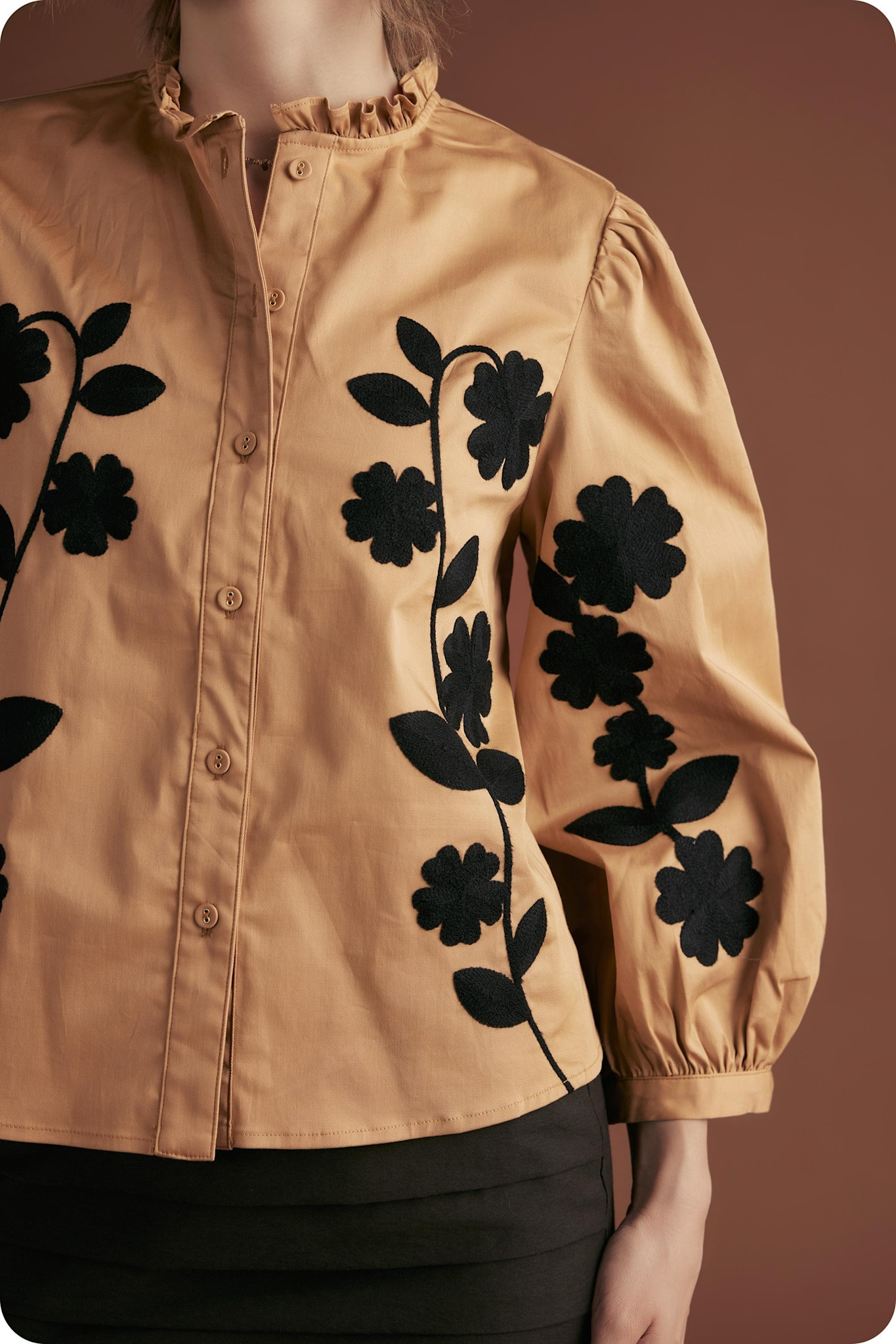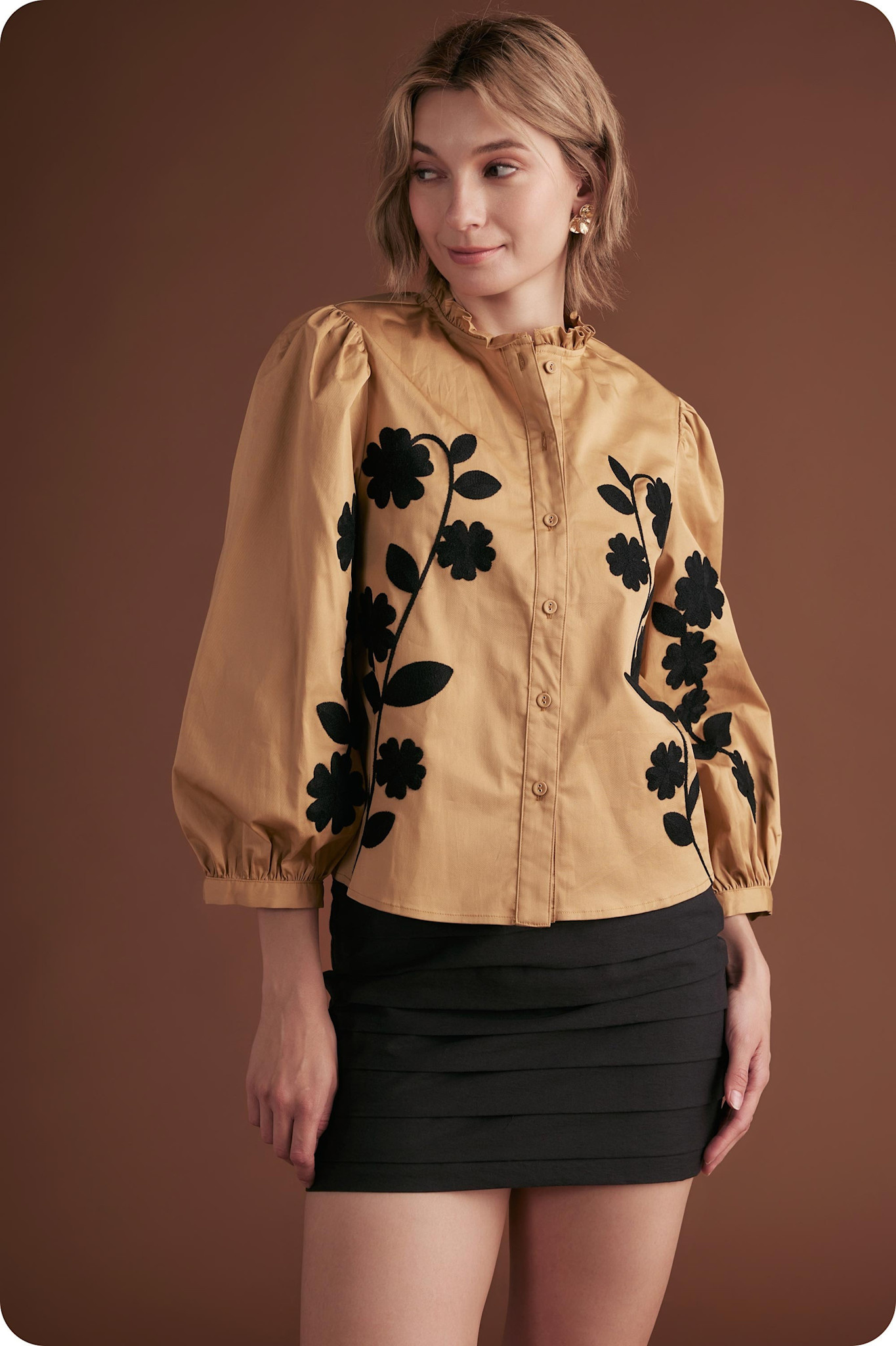 3/4 sleeve flower embroidered ruffle neck shirt in stretch lightweight twill fabric. This button down top features a ruffled mock neck, floral embroidery throughout, button closure at front, 3/4 puff sleeve with cuff, and shirred shoulder.