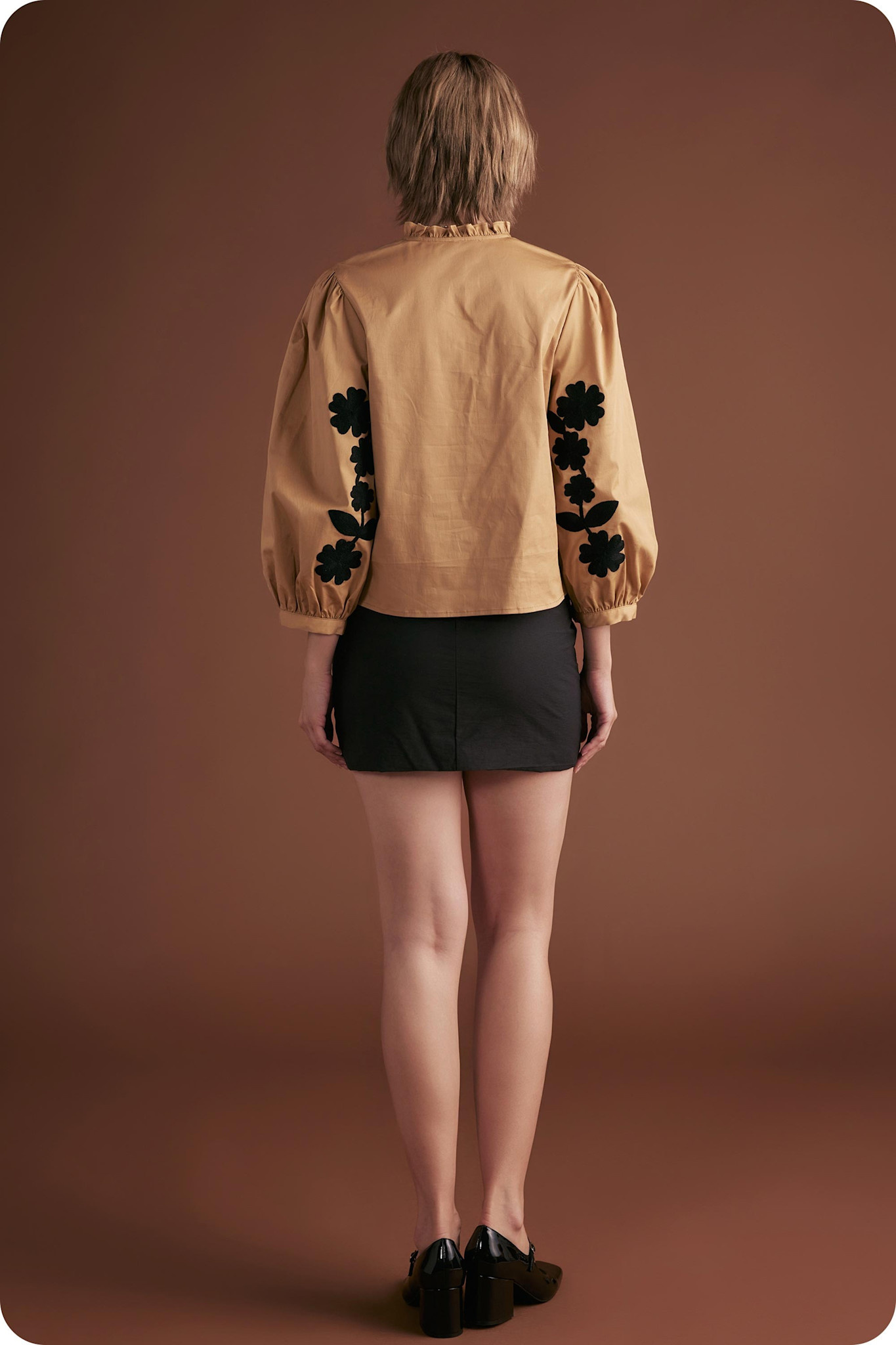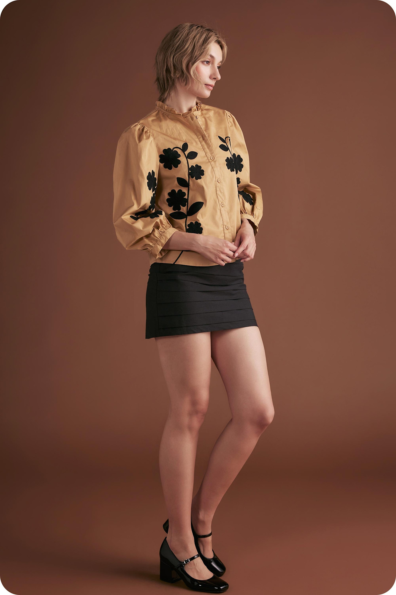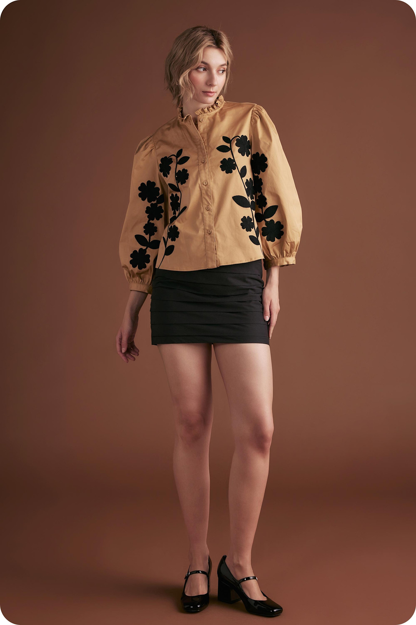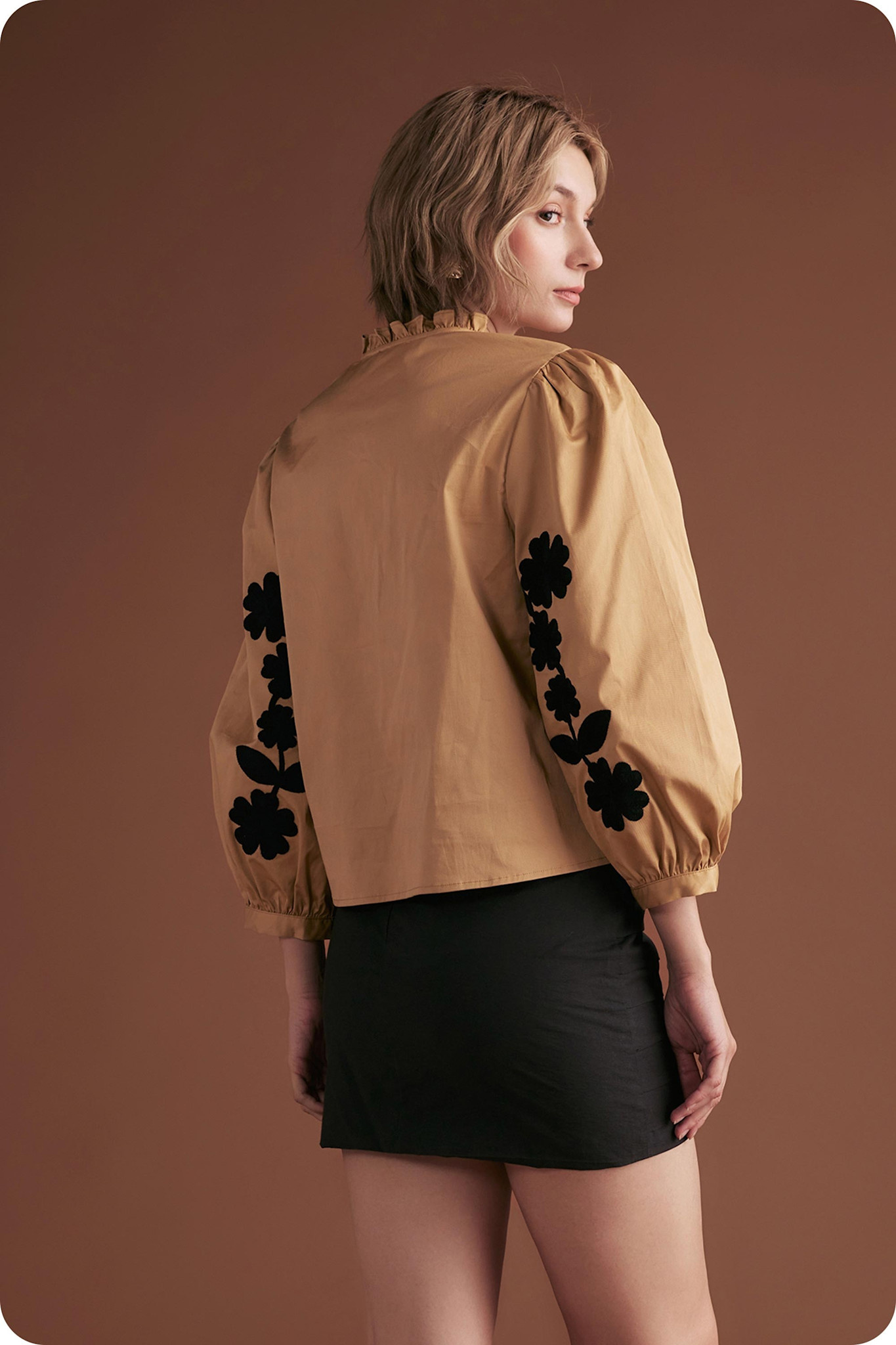 3/4 sleeve flower embroidered ruffle neck shirt in stretch lightweight twill fabric. This button down top features a ruffled mock neck, floral embroidery throughout, button closure at front, 3/4 puff sleeve with cuff, and shirred shoulder.