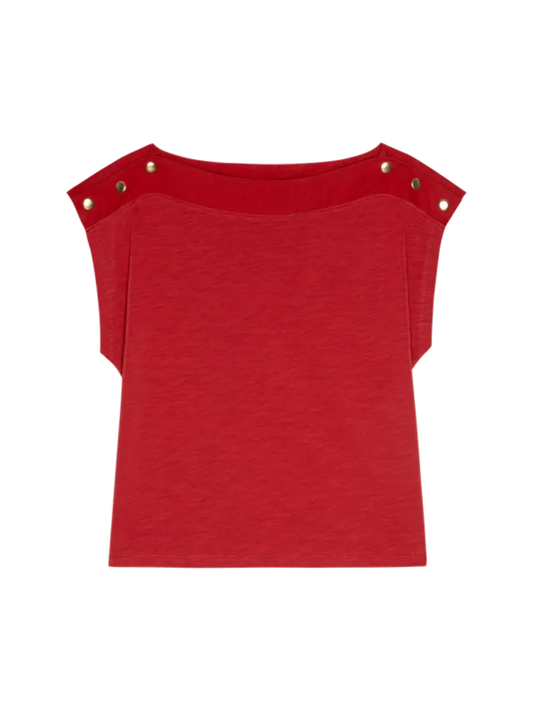 Your signature edgy muscle tee, with a little more flare-meet the Marina. Designed in cotton jersey, this tee features a relaxed bodice, our signature snap closure and crew neckline.