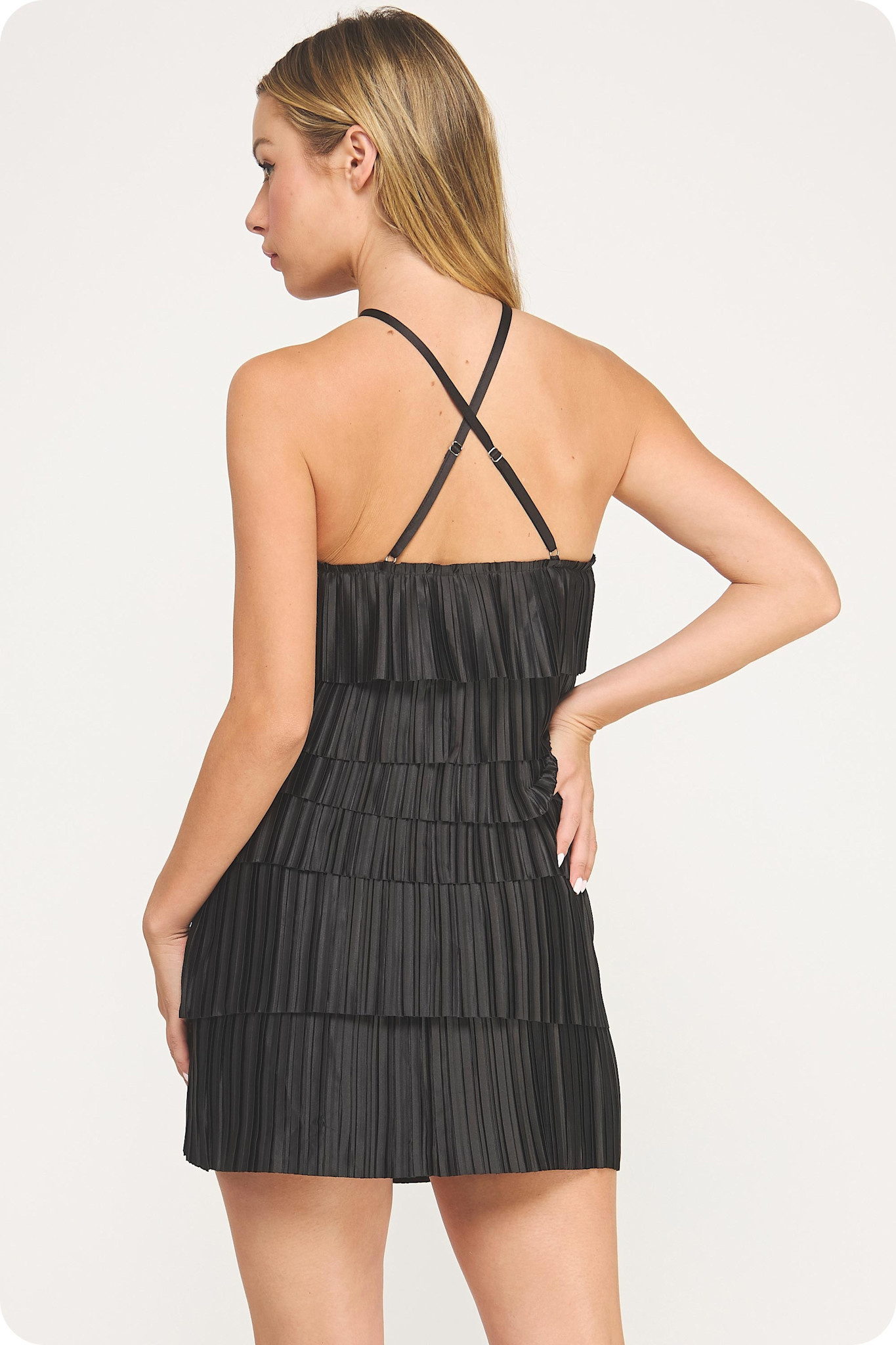 • Pleated tiered mini dress in satin fabric. This sleeveless mini dress features a halter neck with adjustable straps at back, tiered construction with plissé satin, lining, and hidden zipper closure. The perfect dress for the holiday season or a night out.