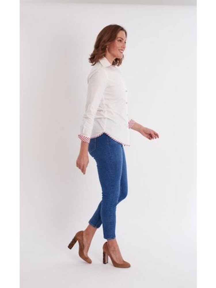 The Bryson Button Down in White/Mulberry Stripe puts a playful spin on a classic look. Featuring clean, crisp white fabric with gold buttons and peek-a-boo striped cuffs, this shirt adds a fun surprise to your everyday style.
