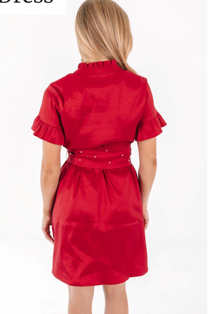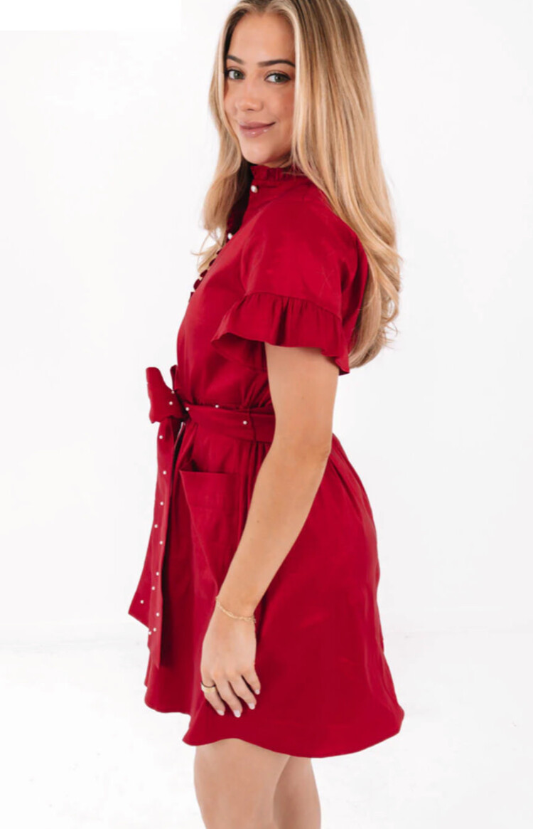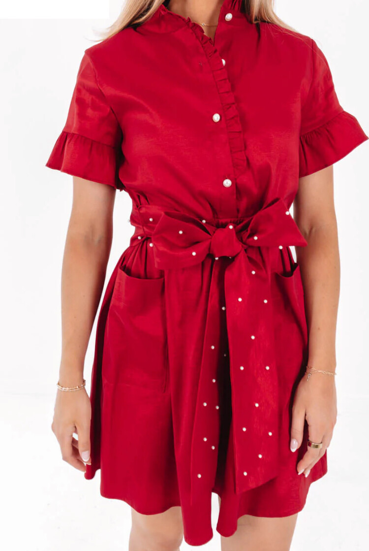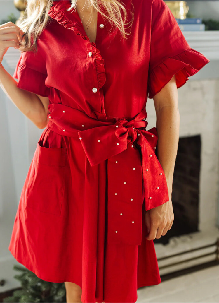 • Add a polished touch to your wardrobe with this red dress featuring elegant pearl accents & two front pockets. The button-up neckline & sleek silhouette create a chic, refined vibe - perfect for special occasions or stylish family photos.