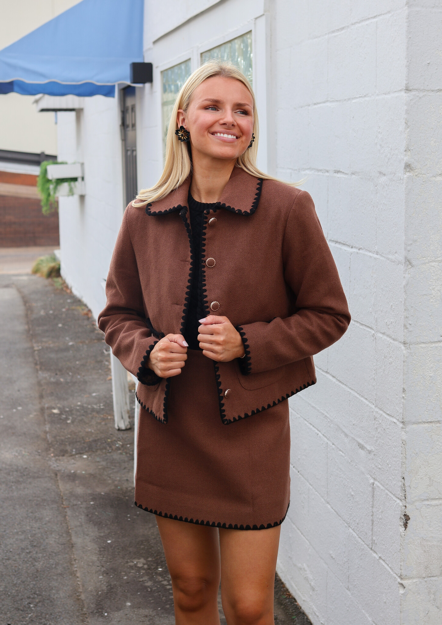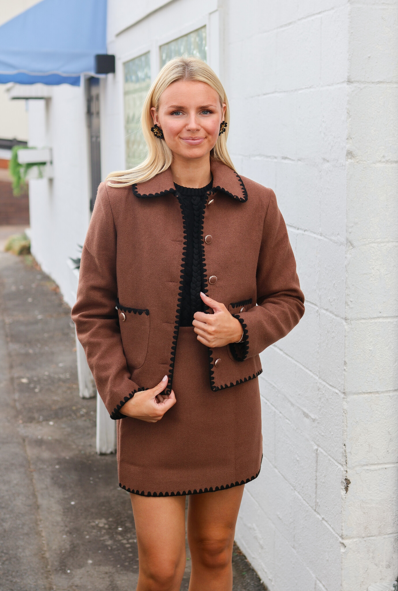 • Embroidery contrast jacket in boucle fabric. This timeless chic style features embroidered edge detail throughout, luxe button closure at front, front pockets, spread collar, lining, and long sleeves. It can be made into a set with skirt