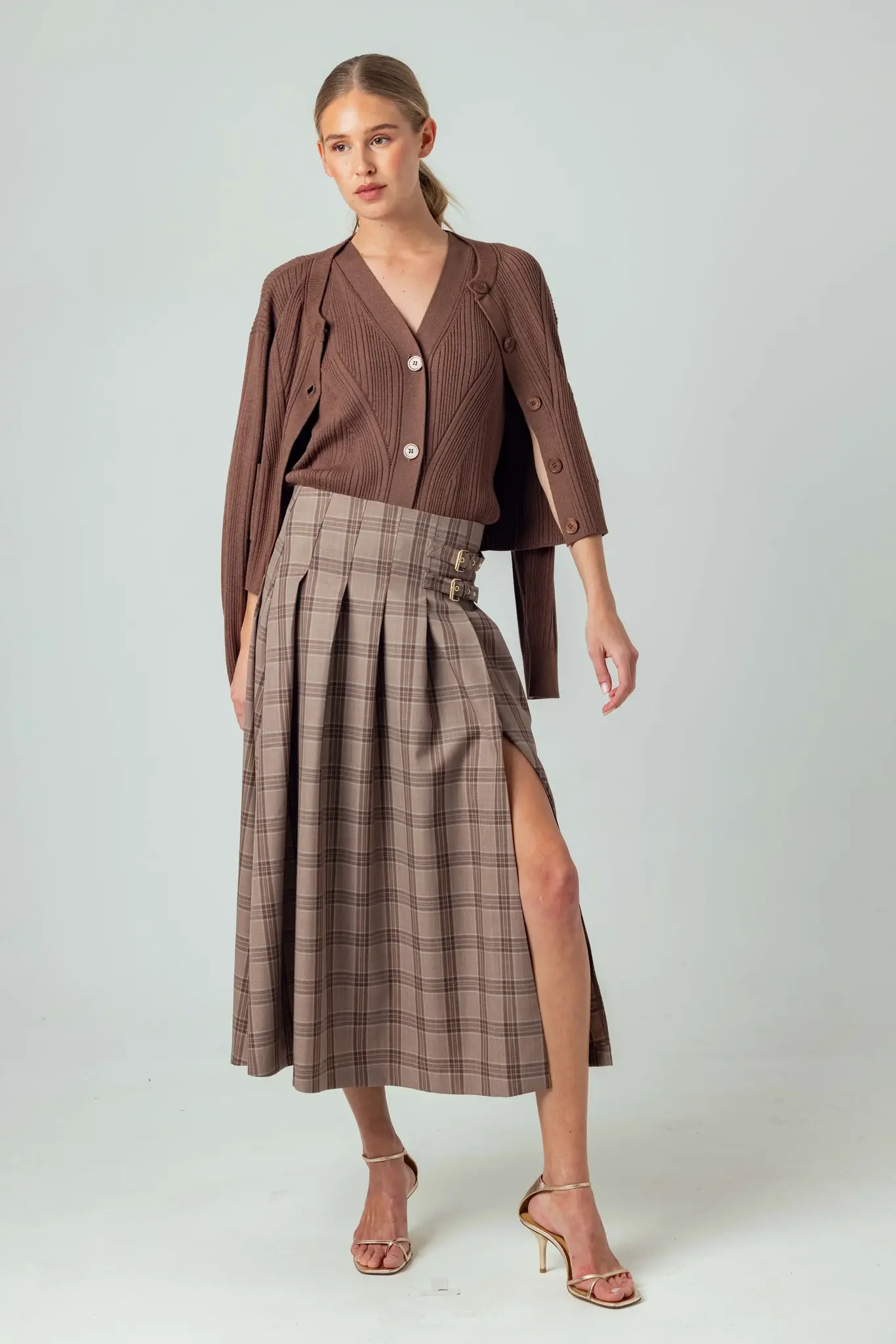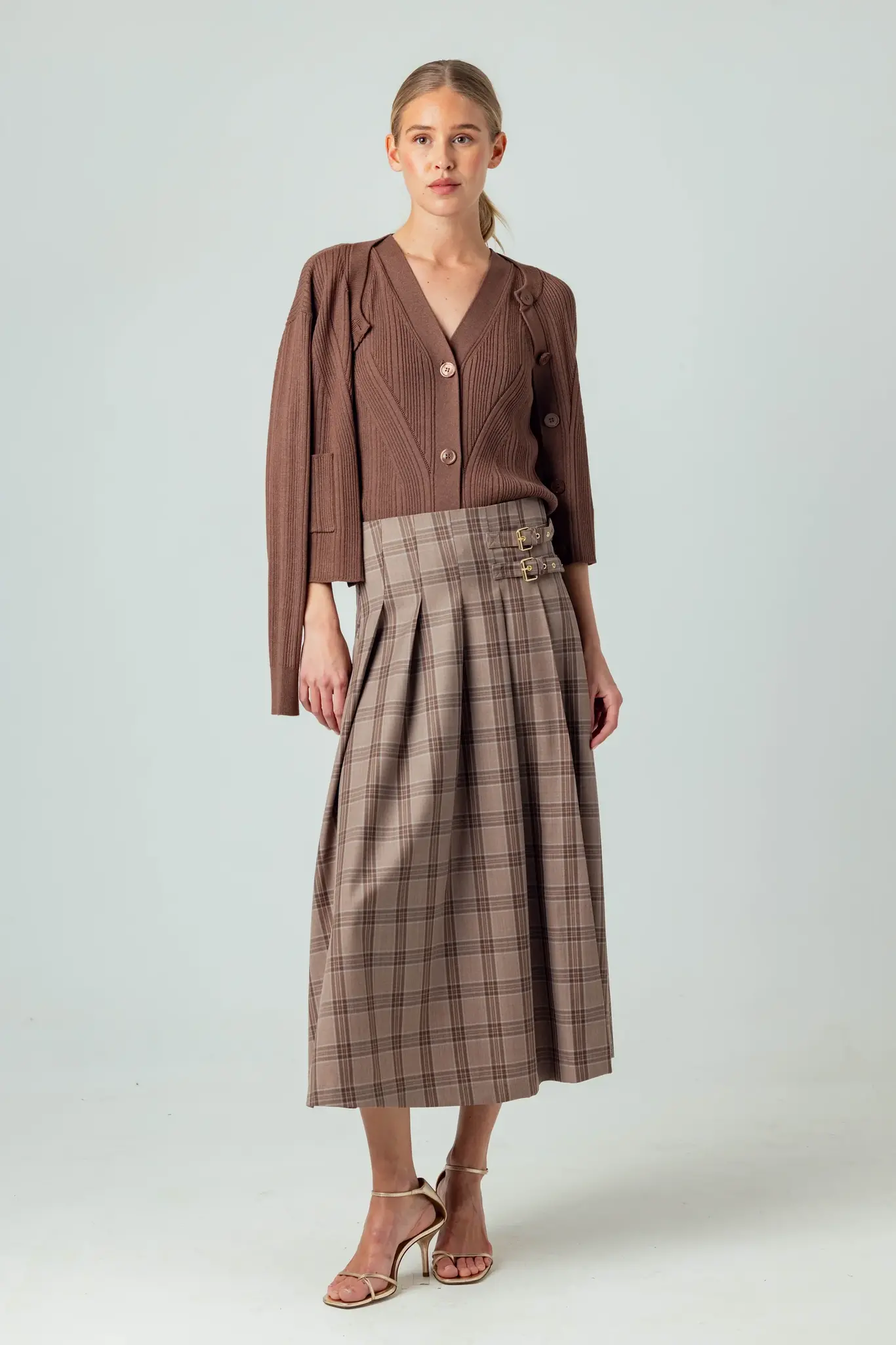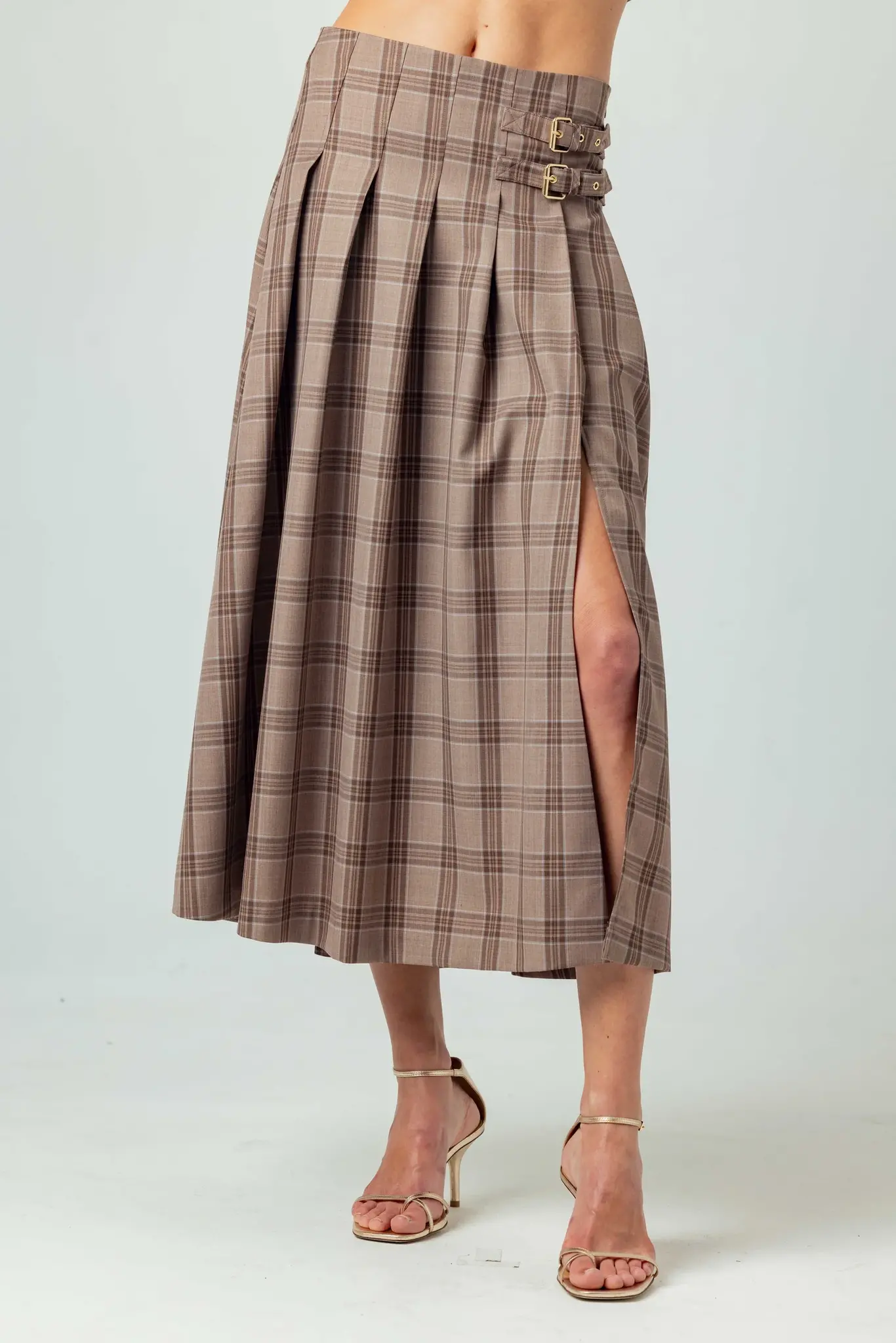 Featuring warm tones with a subtle blue accent, this skirt is designed with a darted waist for a slimming silhouette that flows into pleats at the hips. Accented with double gold buckles and a high slit, the pleated length finishes just past midcalf.