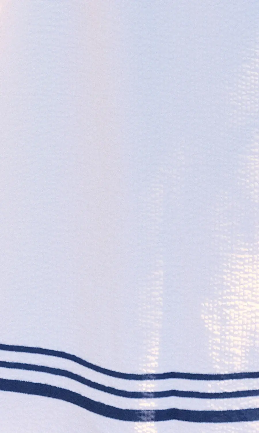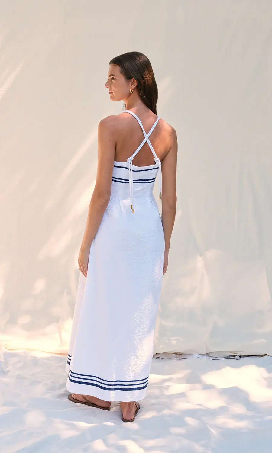 • Ahoy, fashion mate! This seersucker stunner features charming rope straps, a square neckline, criss cross straps on the back, and a navy blue grosgrain ribbon trim along the hem. Perfect for soirées, seaside strolls, or just pretending you're on a yacht.