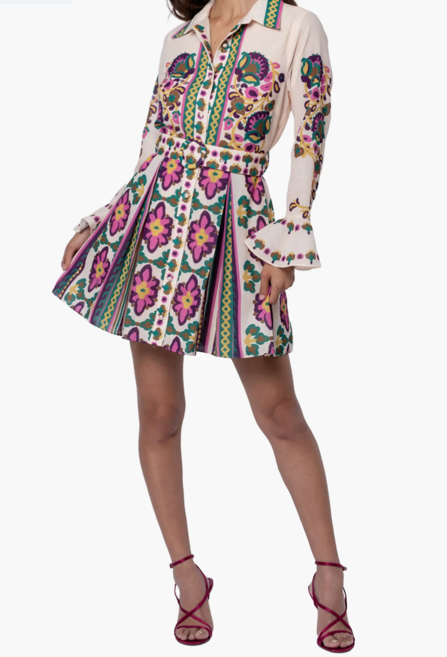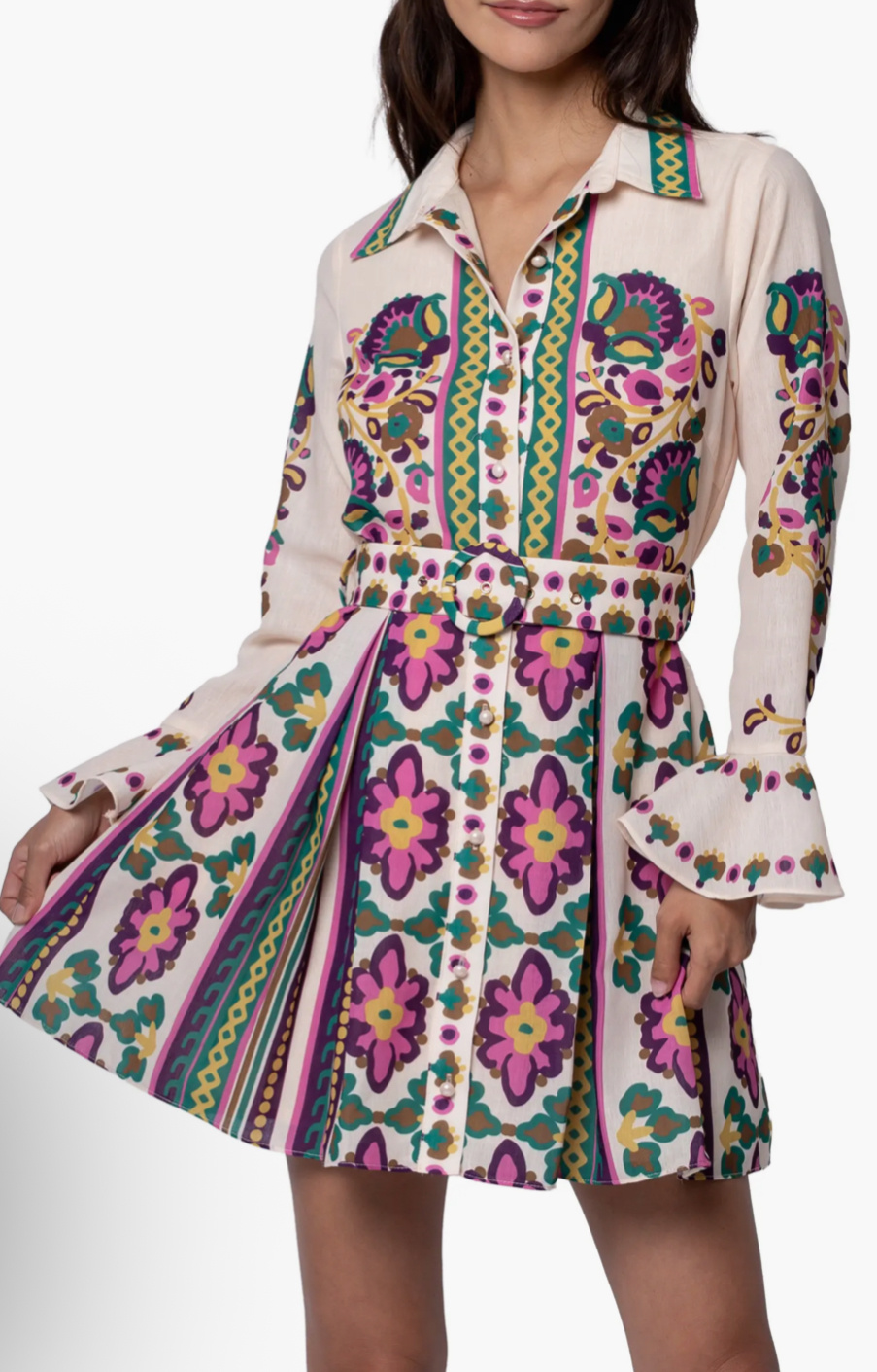 • Vibrant color and lively prints enliven a classic shirtdress served with ruffled cuffs. 100% polyester