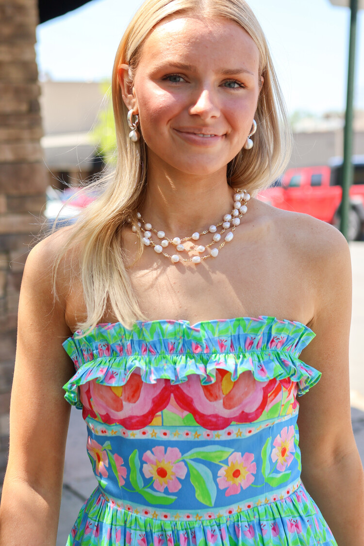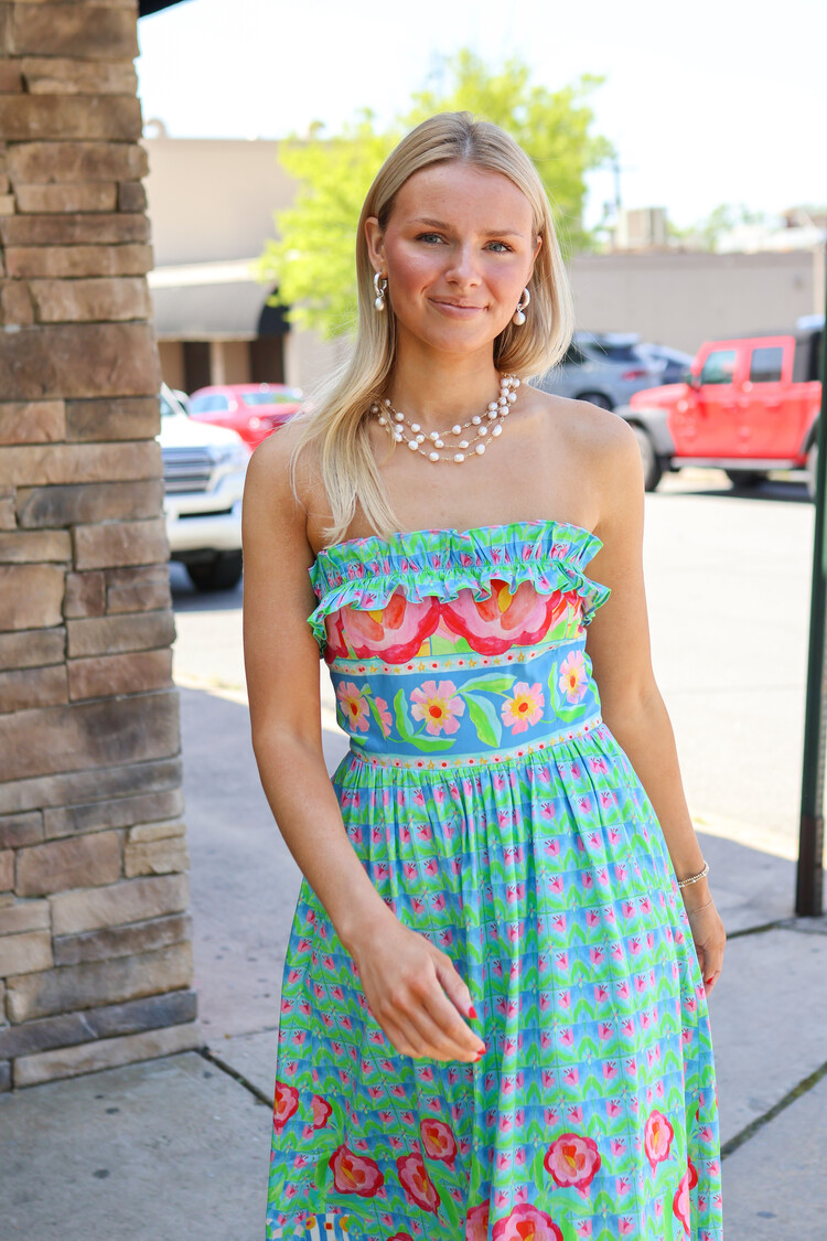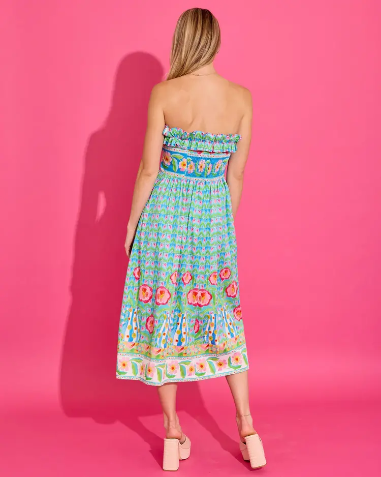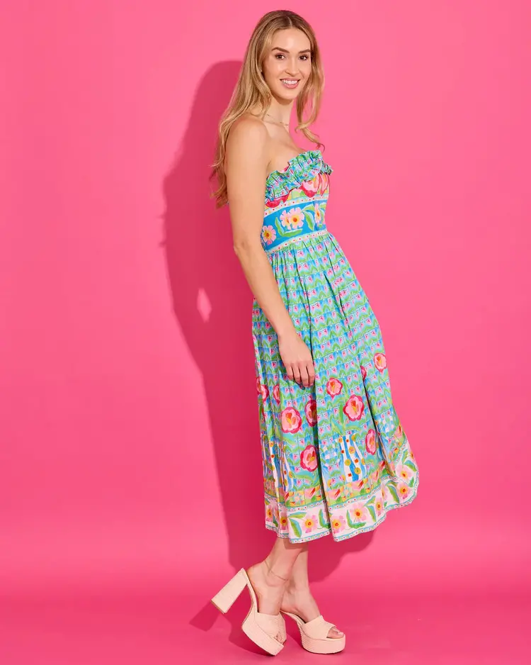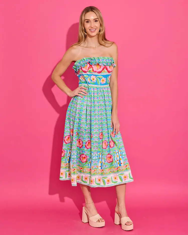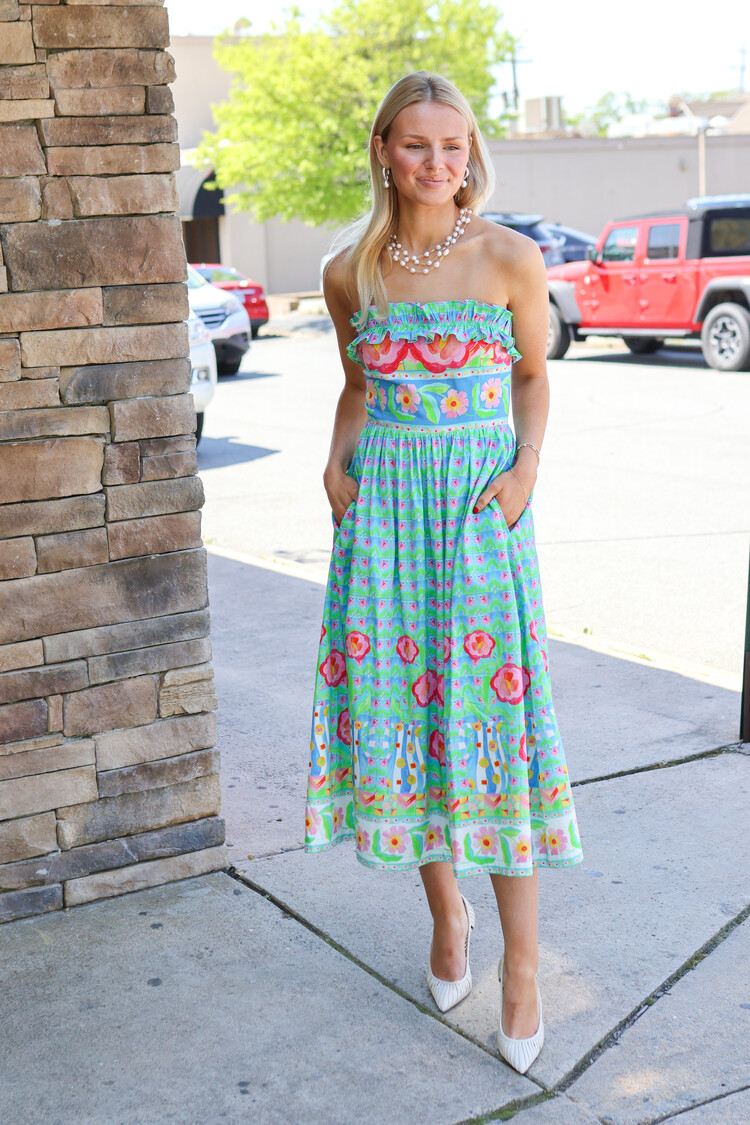 Crafted in stretch cotton poplin in a floral vine print, this piece features contrasting ric-rac trim, a tiered skirt, pockets, and a stretchy waistline. This fully lined dress is perfect for backyard parties, date nights and dinner al fresco with friends