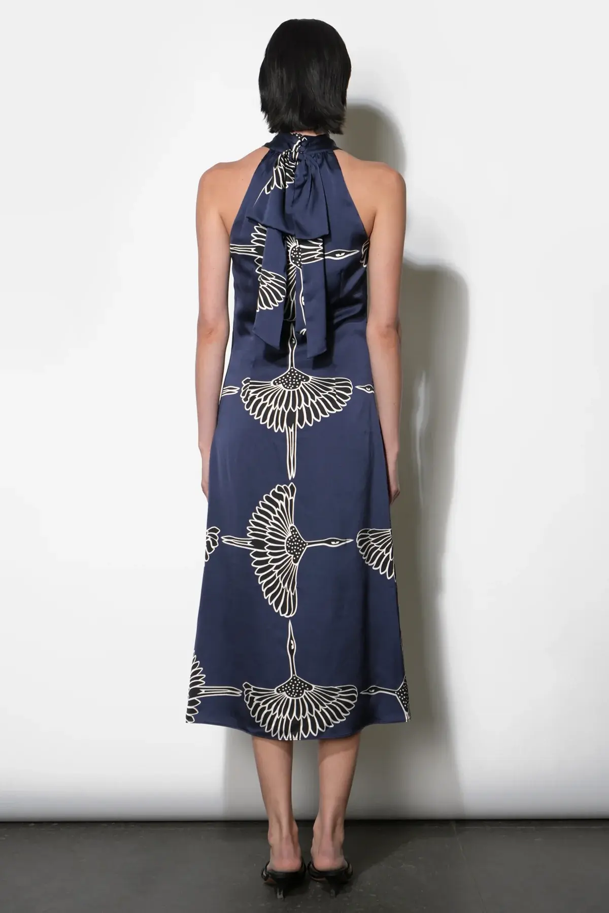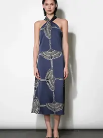 Crafted from a luxurious satin fabric, the dress offers a beautiful sheen and a fluid drape that moves gracefully with the wearer. The silhouette features a halter neckline and is finished with a delicate ribbon tie closure at the neck.