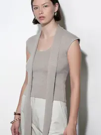 This design element eliminates the need for separate accessories and allows the wearer to tie, drape, or wrap the scarf for various sophisticated looks, all while maintaining the comfort of a knit top.