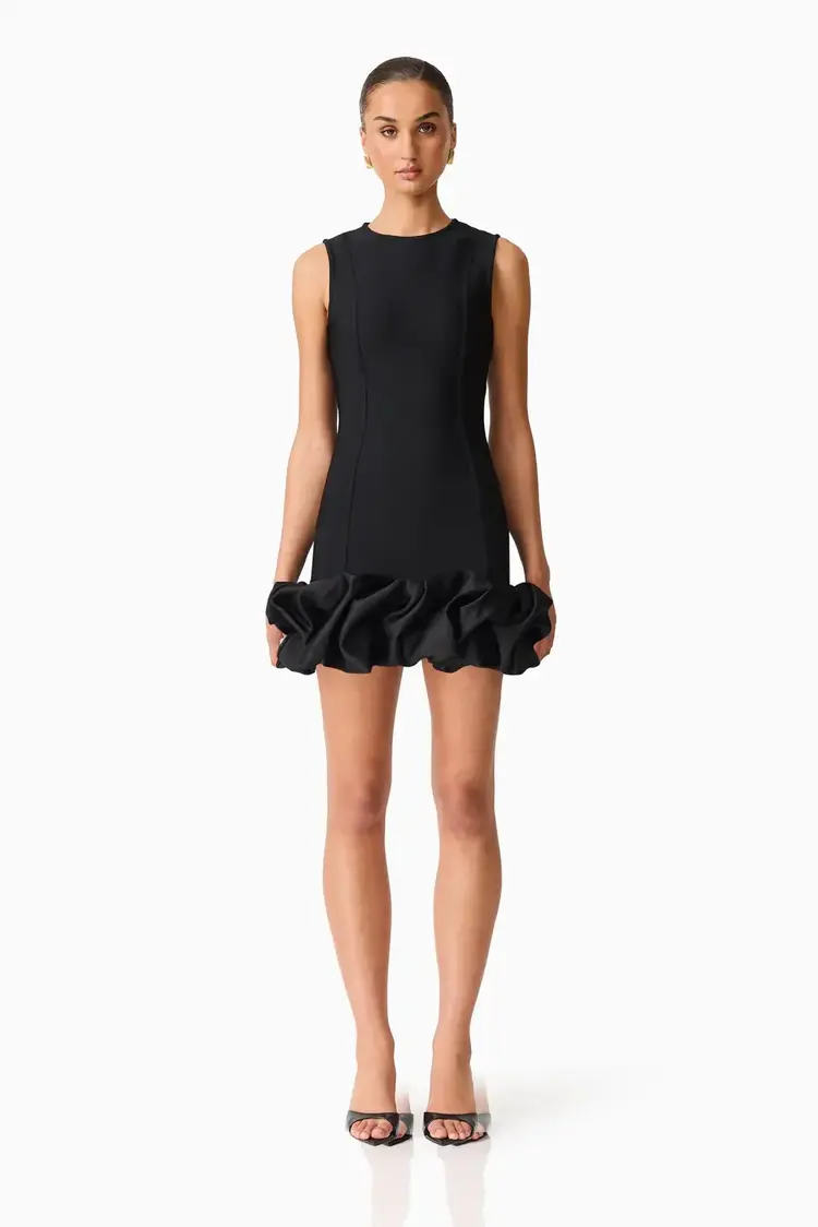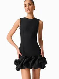 • Crafted from premium double knit/duchess satin fabrication, this dress offers a smooth, lustrous finish that enhances its timeless black hue. The fitted silhouette flatters the figure, while the satin bubble hem adds a touch of playful volume and movement
