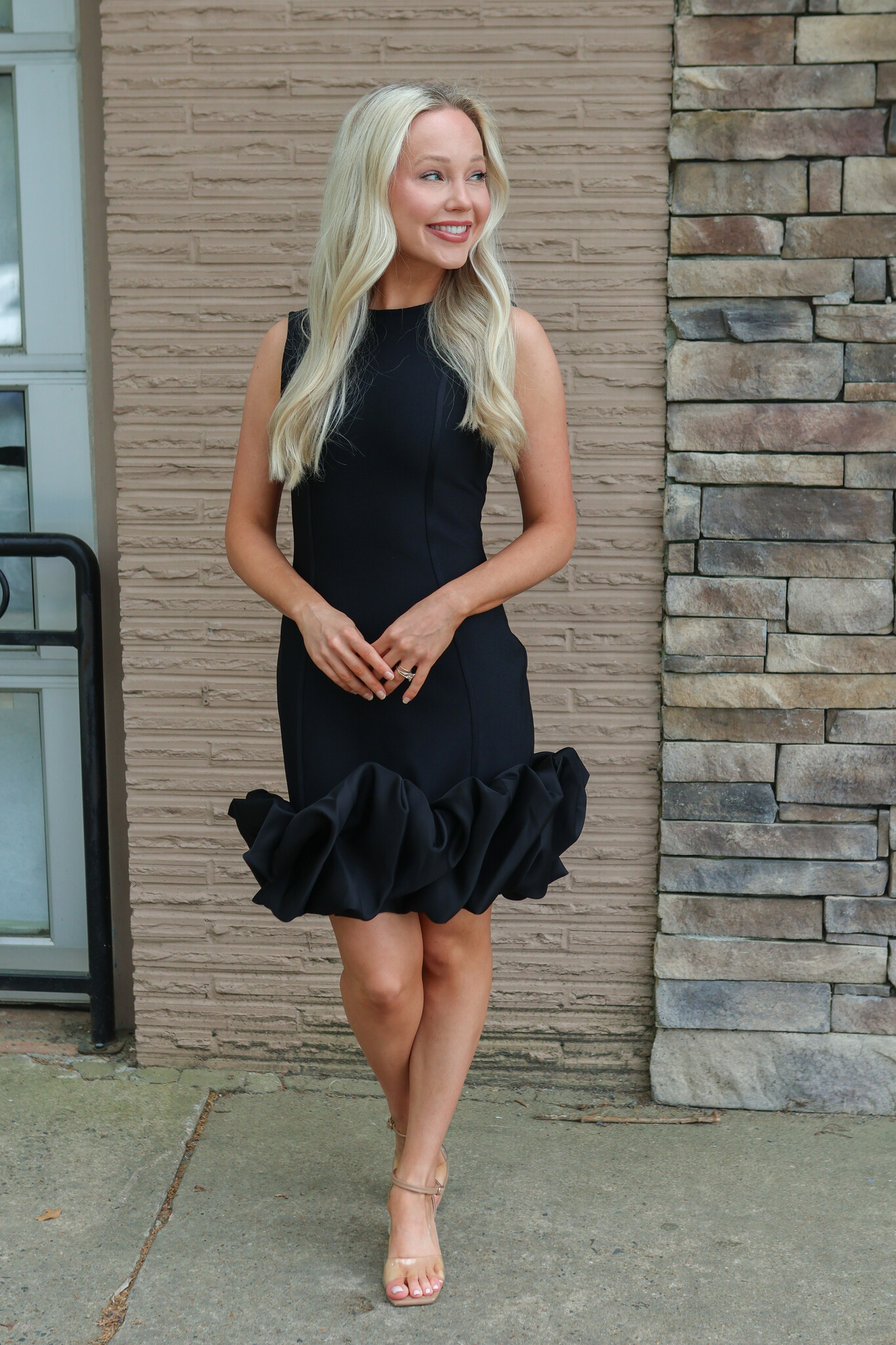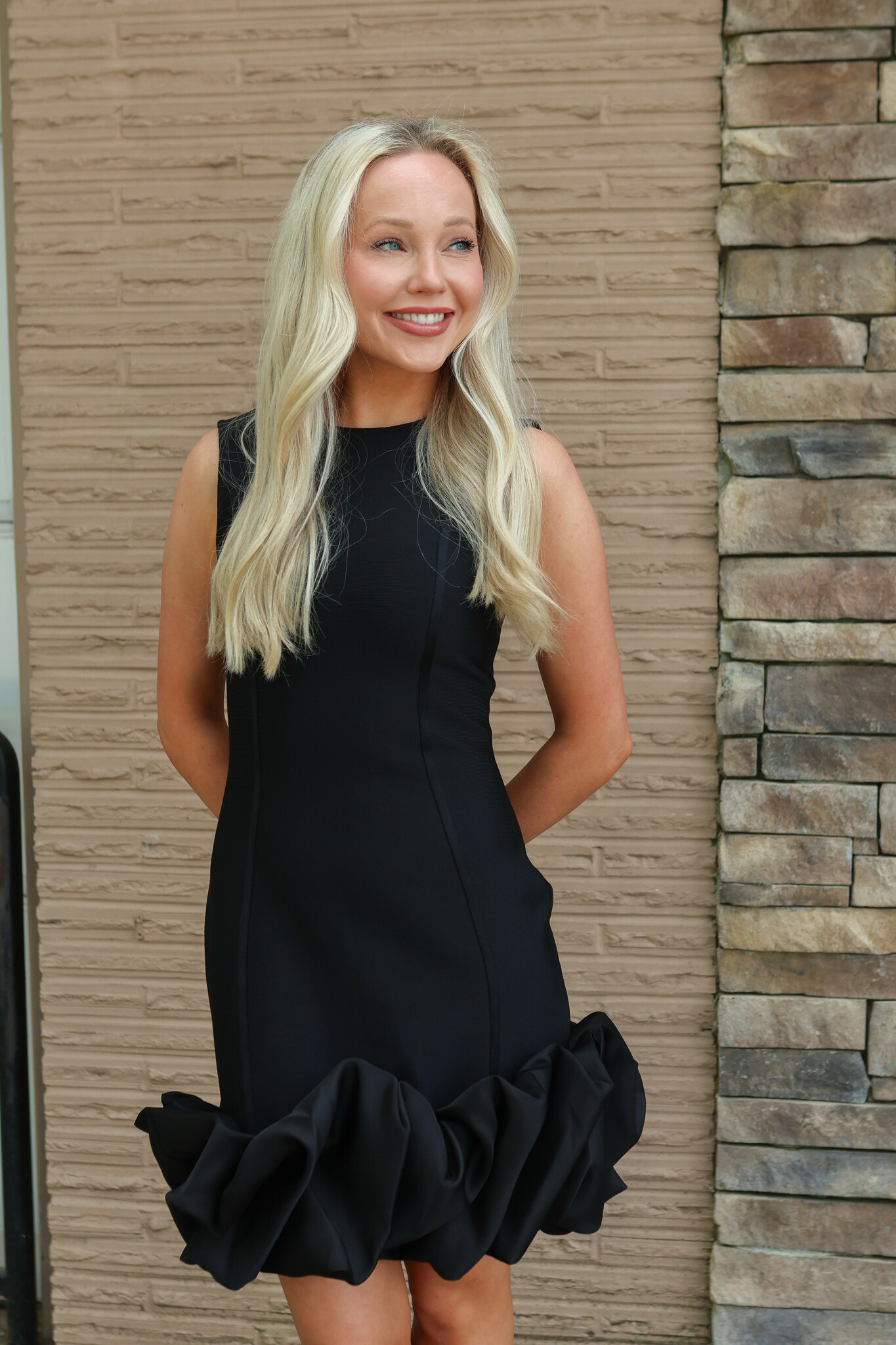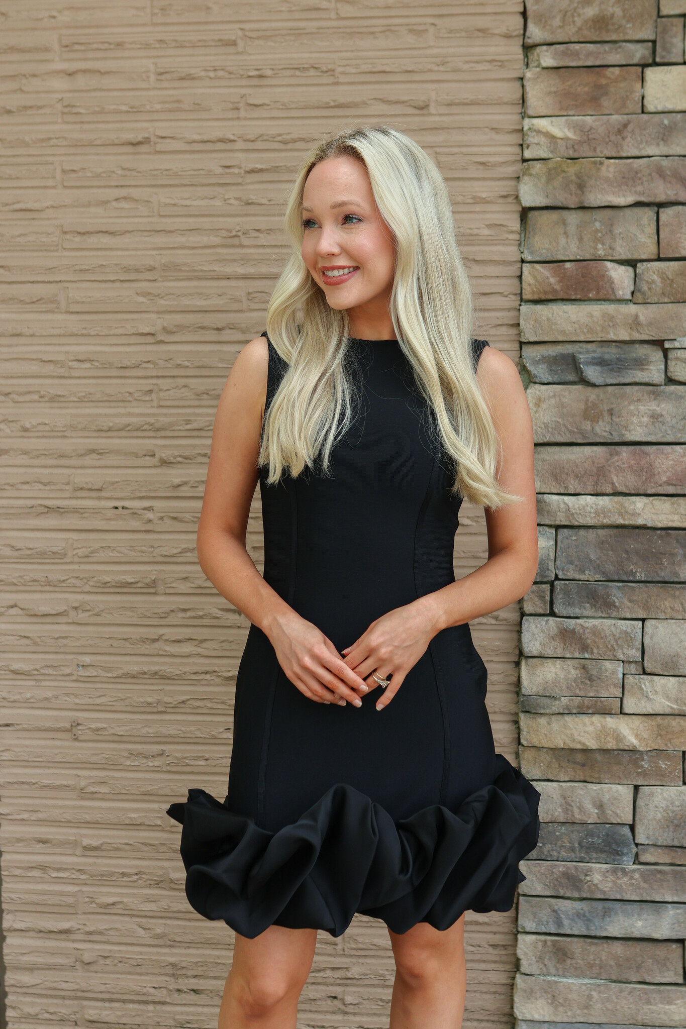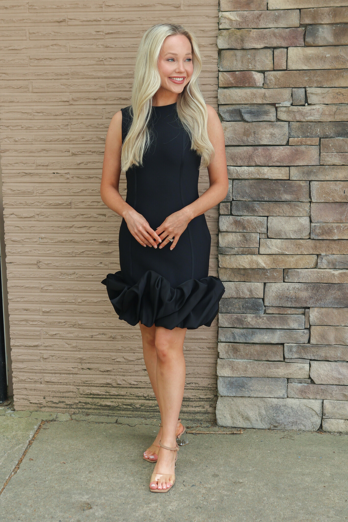 Crafted from premium double knit/duchess satin fabrication, this dress offers a smooth, lustrous finish that enhances its timeless black hue. The fitted silhouette flatters the figure, while the satin bubble hem adds a touch of playful volume and movement