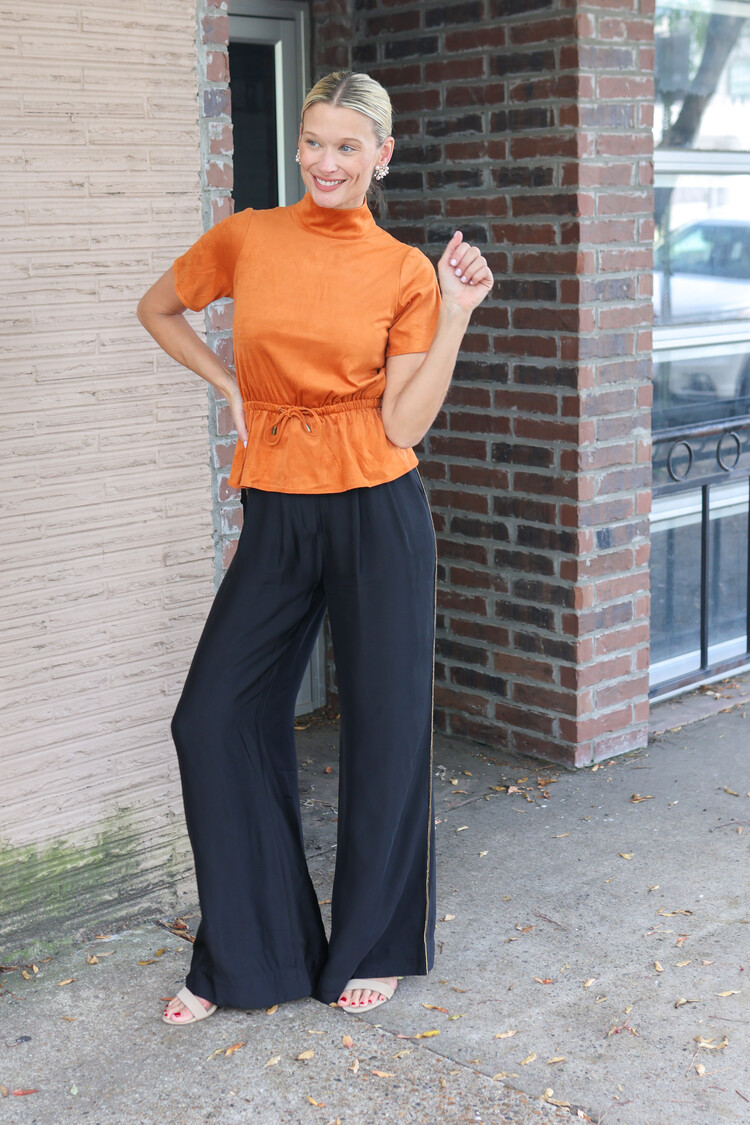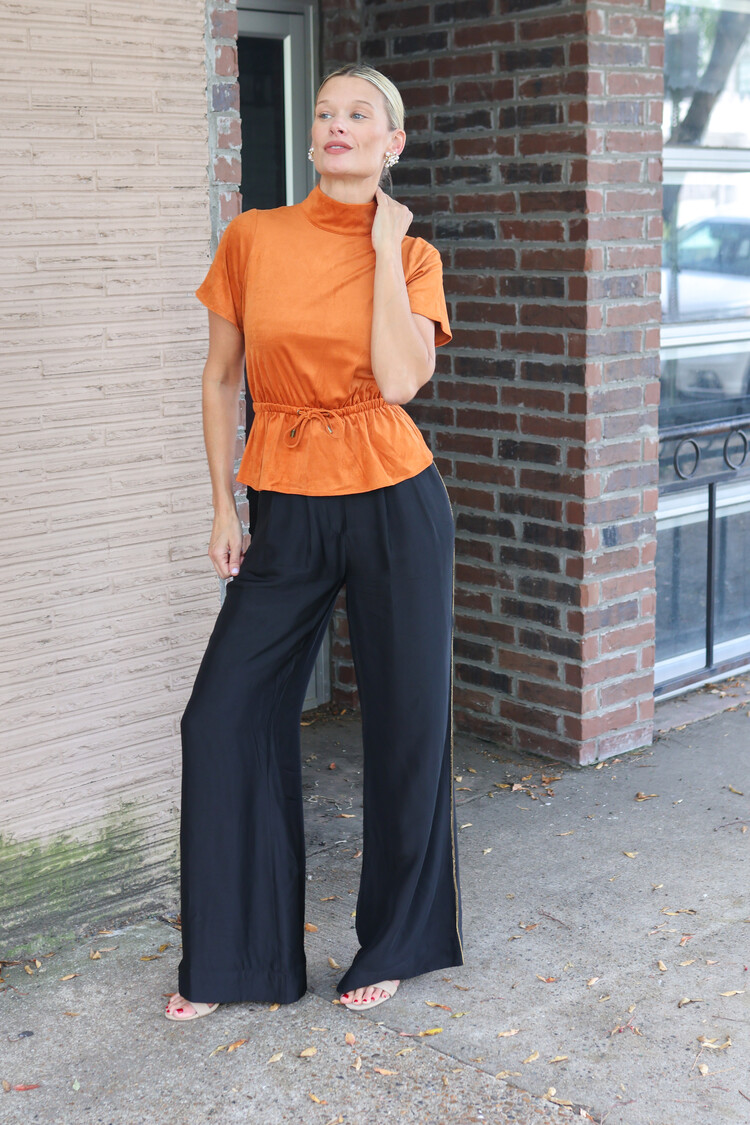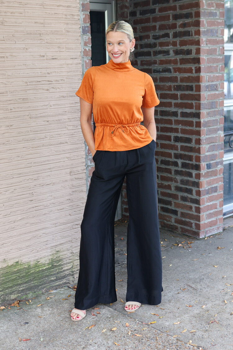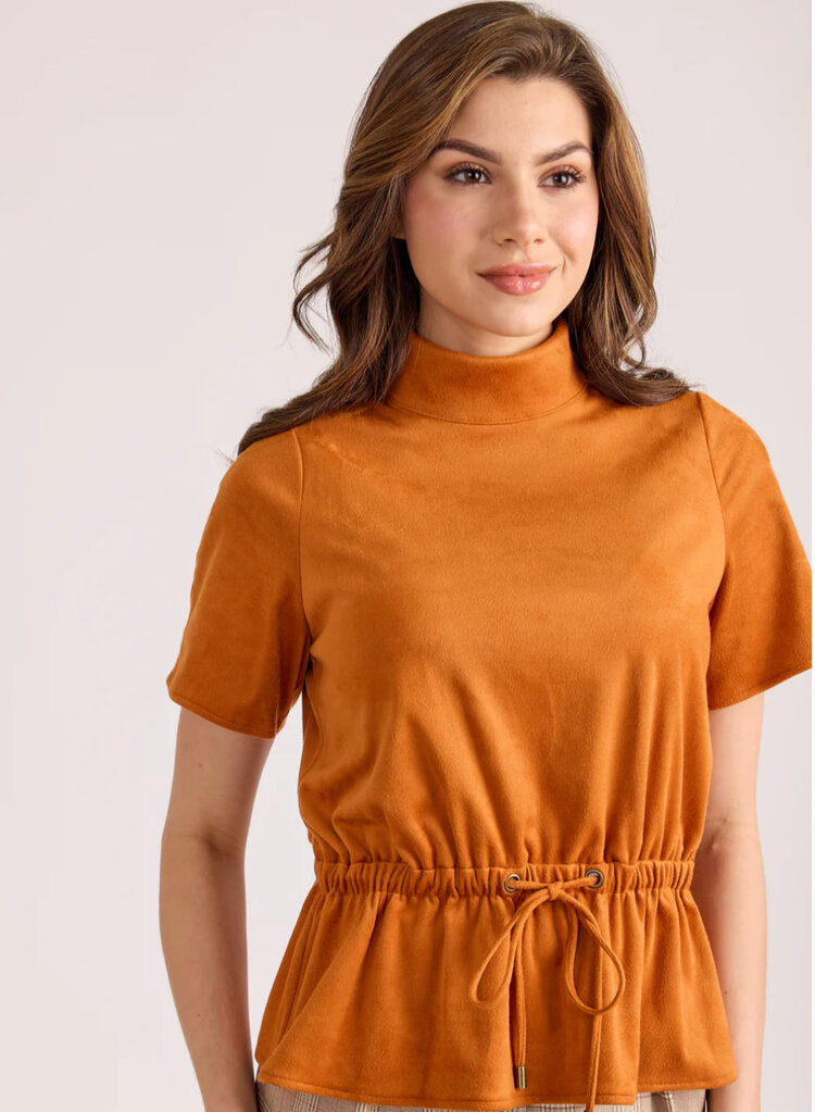• Elevate your wardrobe with the Celia Top in Pumpkin, crafted from soft suede for a luxurious feel. Its high neck and short sleeves create a chic silhouette, while the adjustable tie waist lets you customize the fit for flattering shape.