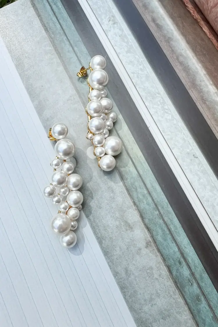 Pop the bubbles in our New fun, Pearl Cluster Drops. Inspired by champagne bubbles and perfection for any celebration! 18k gold plated brass design with faux pearls set in a clustered design. Lightweight and comfortable for all day wear