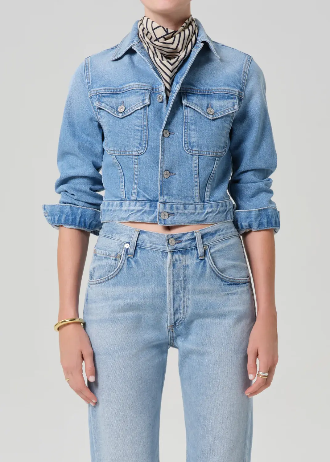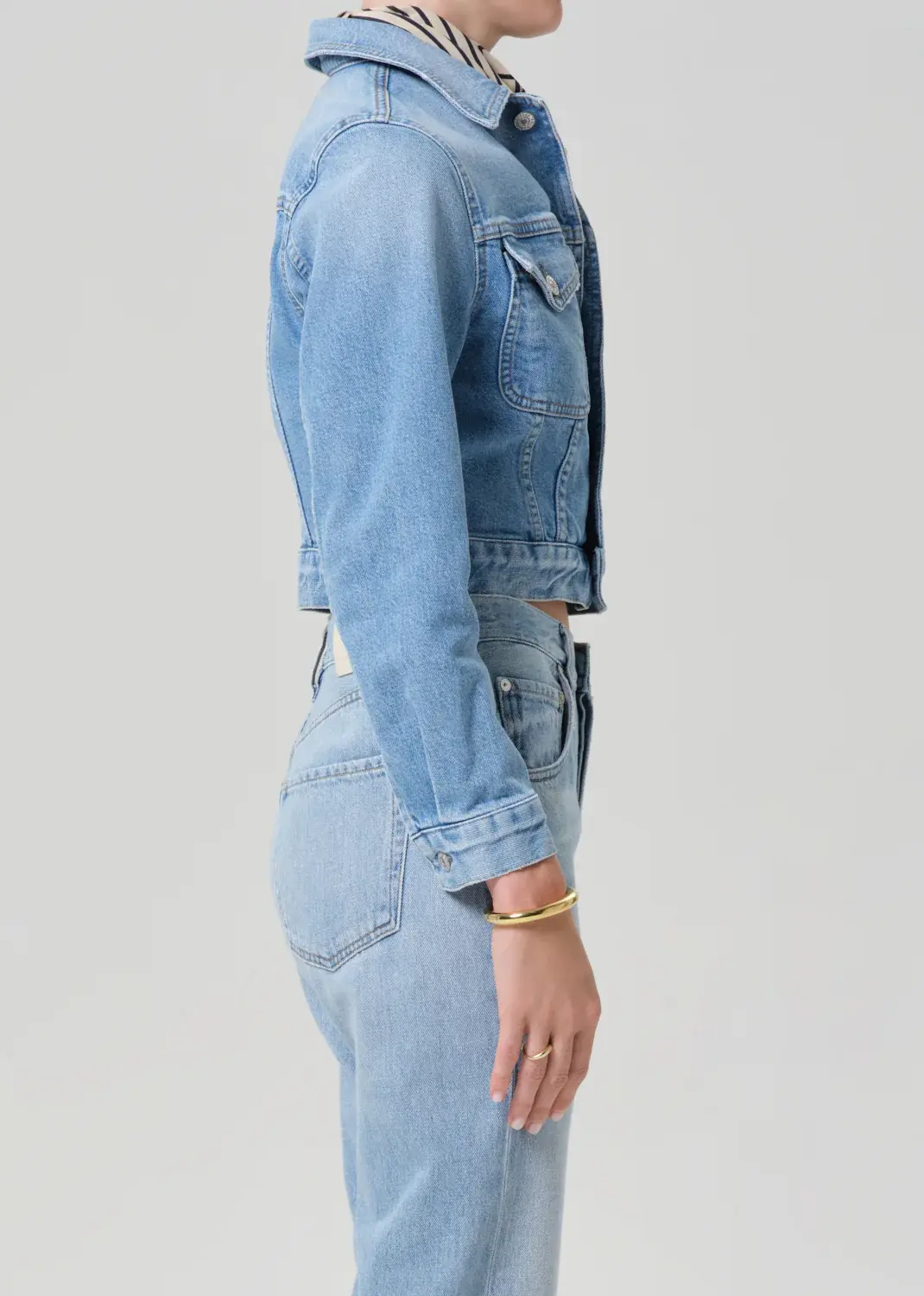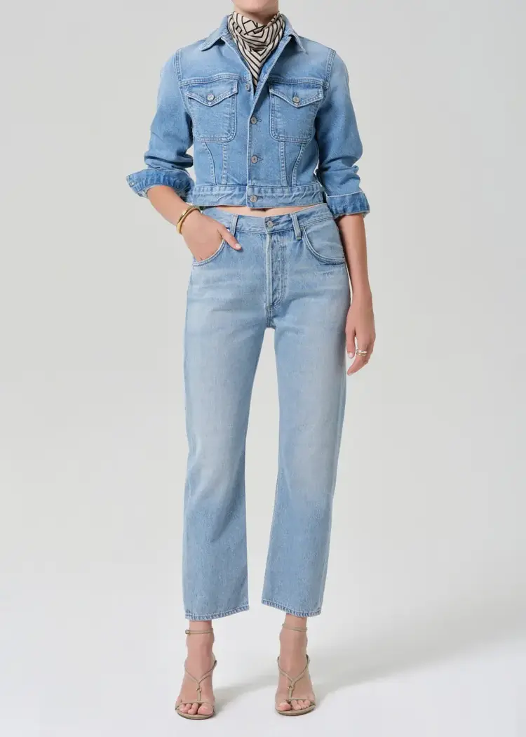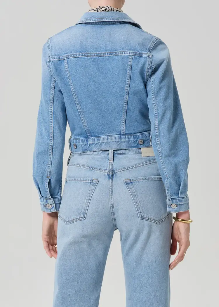 The Charisse Jacket is crafted from bio-stretch regenerative cotton denim with a super-soft hand. The vintage wash enhances its lived-in character, while the cropped, tailored fit layers effortlessly over tees or knits for an elevated everyday look.