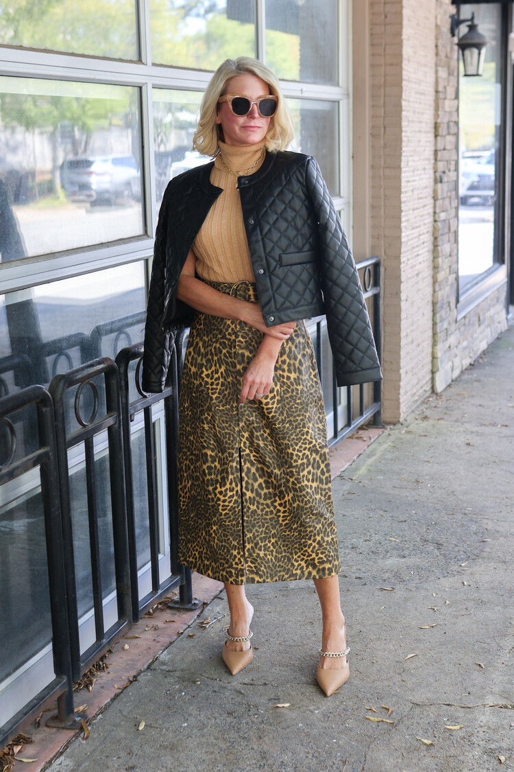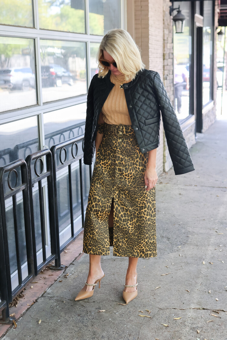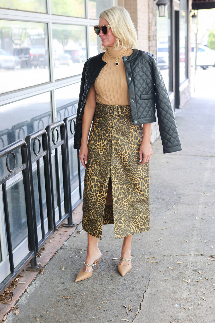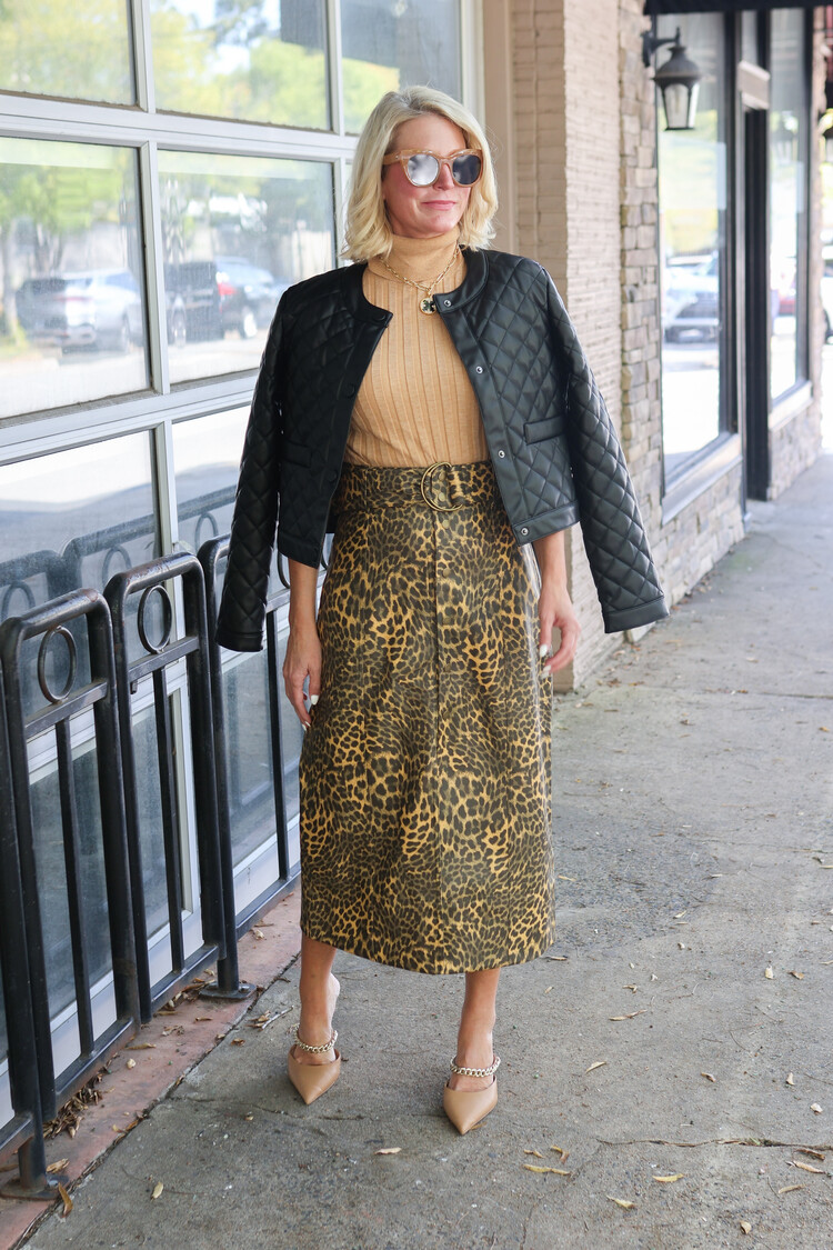 This vegan leather midi skirt’s timelessness that allows it to live beyond current trends. The optional tie belt with trapunto detailing completes the look.