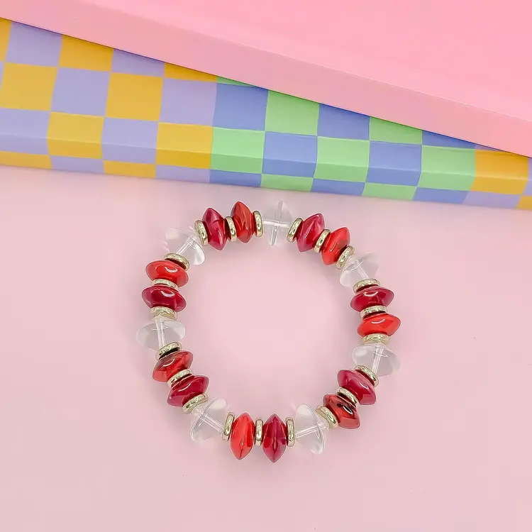 • Bring the fun with bold red and frosty clear beads! Perfectly spaced with golden accents for a playful yet polished look.