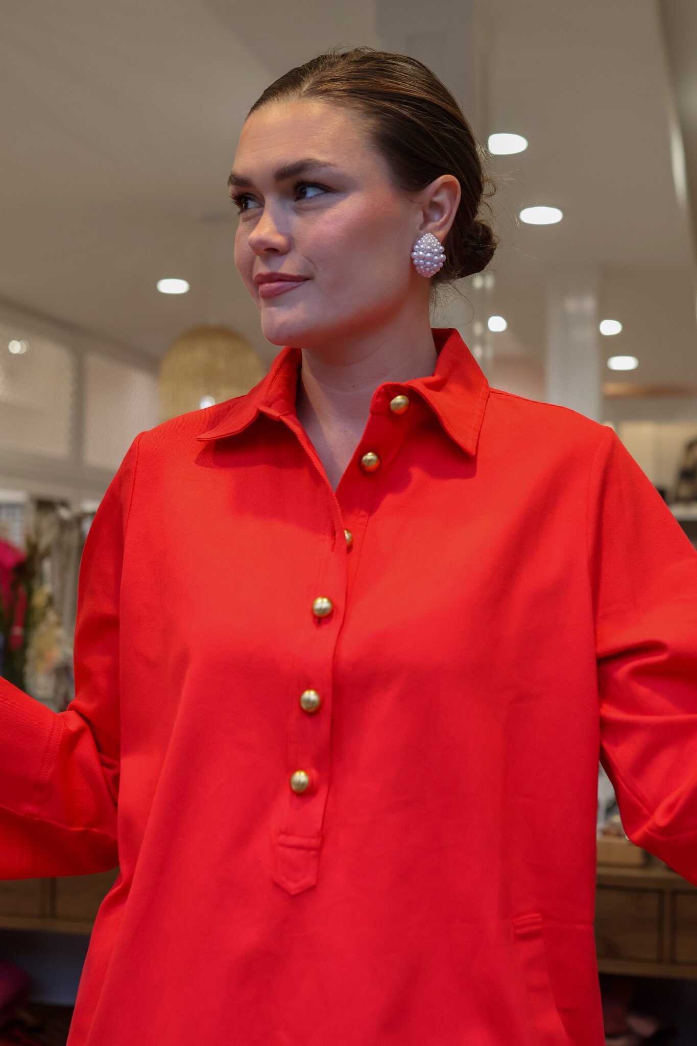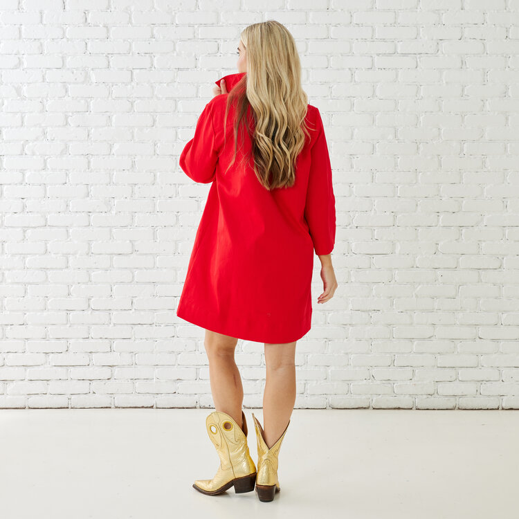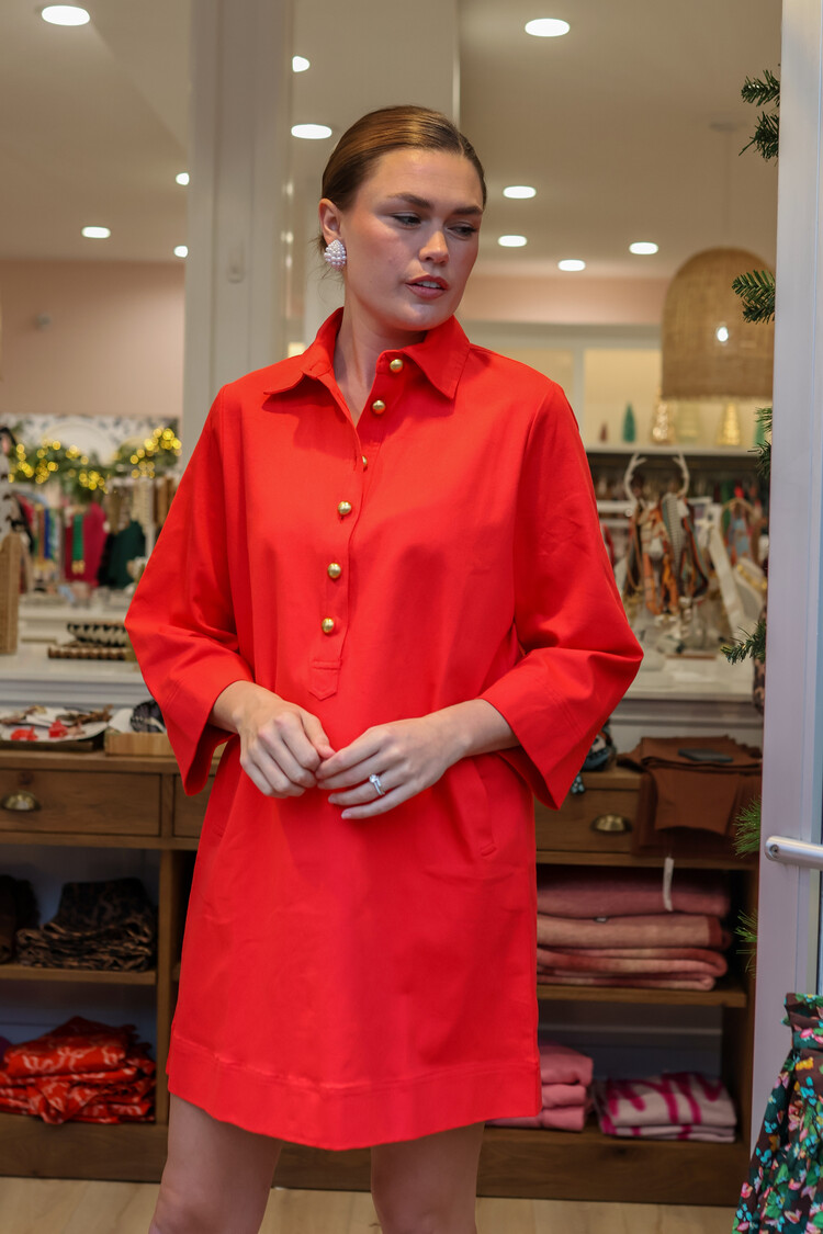 Your go-to dress for the season — bold color, flattering shape, and easy-to-wear style. The Chloe Dress features a stand-up collar, gold buttons, and a relaxed fit that looks great dressed up or down.
