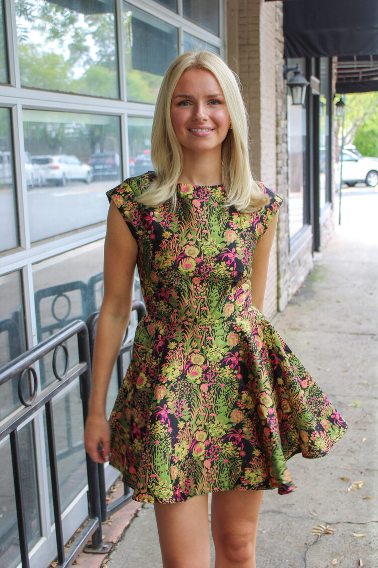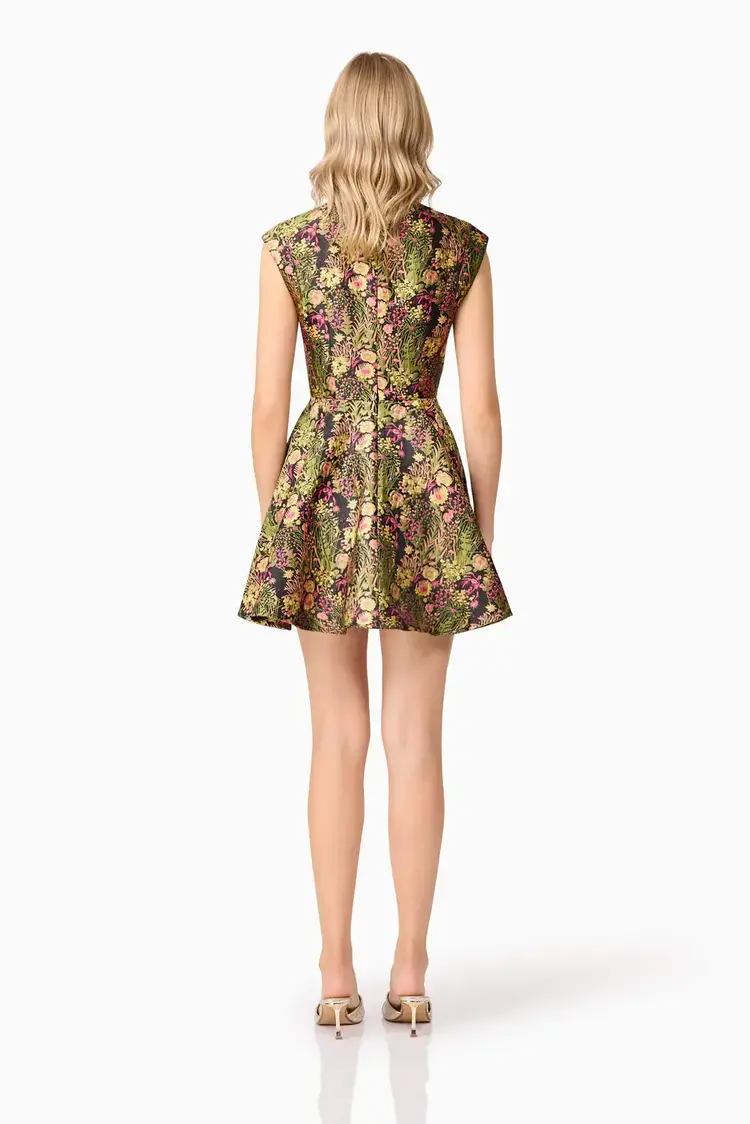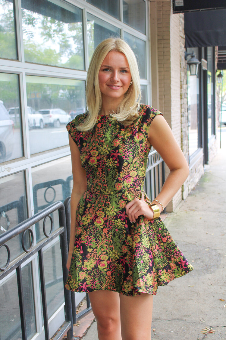 • This dress cinches at the waist before flaring into a feminine skirt, creating a timeless silhouette. The structured high neckline adds a touch of sophistication, while the wide shoulder design offers a balanced and polished look.