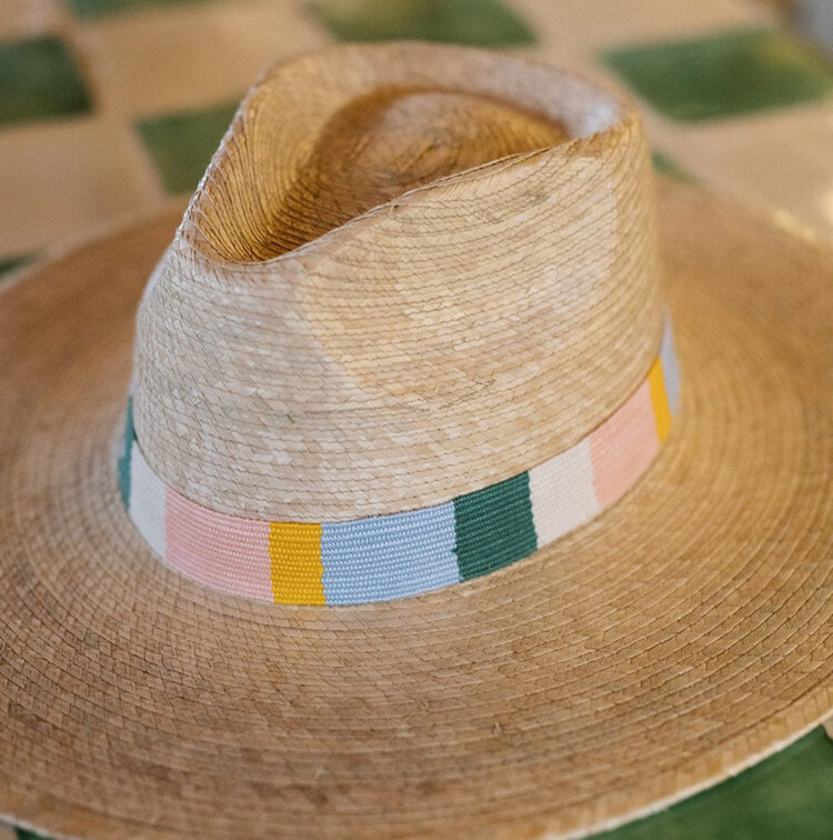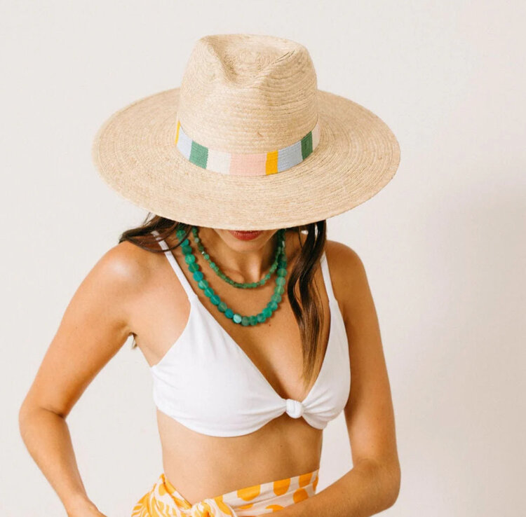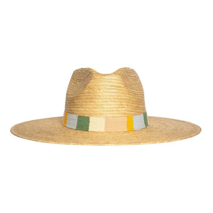• The Clara Palm Hat features a cotton band with sage, ivory, pink, gold and blue stripes and is a part of our sustainable, fair trade hat collection and graded at the highest UPF rating.