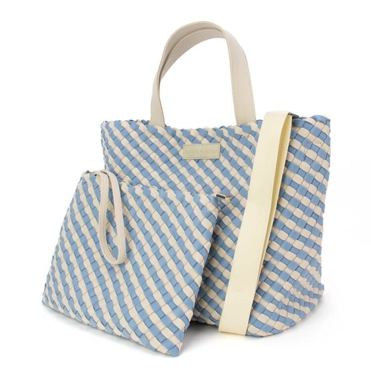 • The Hampton Woven Tote is where effortless style meets ultimate versatility. With its chic two-toned design, this tote is perfect for everything from coffee runs to weekend getaways. Dimensions: Expanded: 18” x 9” x 8” Wristlet Pouch: 7.5'' x 9.5"