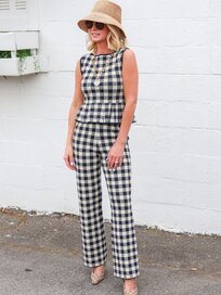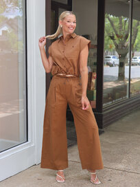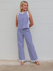 Contrast stripe piping detail wide leg pants in cotton lyocell blend poplin fabric. This style features stripe piping at side, elastic waist with adjustable drawstring tie, side pockets, and straight wide leg. It can be made into a set with vest top