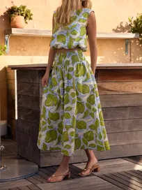 The Georgia Skirt offers a timeless, feminine look with its breezy A-line shape, comfortable smocked waistband, and scalloped hem. Covered buttons trail down the front for a polished finish, while the Zest Leaves pattern adds texture and charm.