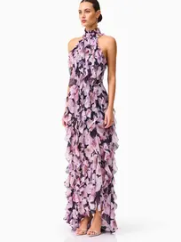 The Solene Halter Gown in Purple Floral is the definition of graceful occasionwear. Designed in a delicate printed georgette, this gown flows effortlessly from day to evening, making it a standout choice for weddings, formal events, and garden parties.
