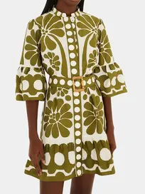 The design is defined by its striking asymmetric waistband, which adds architectural interest and defines the figure in a unique, contemporary way. The dress likely has a structured or tailored fit through the bodice, culminating in a playful dress length