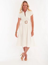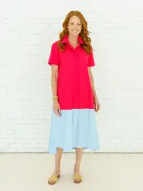 This 50-inch silhouette features a great popped collar and is adorned with a pop of color grosgrain ribbon along the inside placket for a subtle, playful detail. Flowy, flattering, and comfortable, it’s the kind of effortless dress you can throw on and go