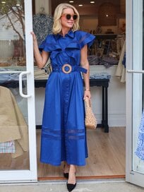 The Oasis Dress captures the spirit of summer days with a silhouette designed to flow from sunrise to “the golden hour”. Crafted from a crisp woven cotton, this tiered maxi features scalloped trim, soft flutter straps, and a flattering square neckline.