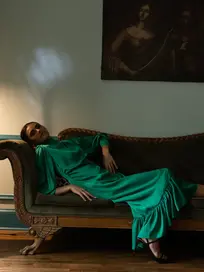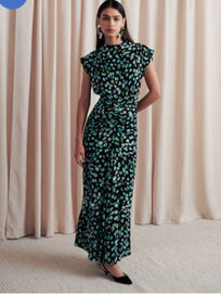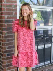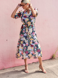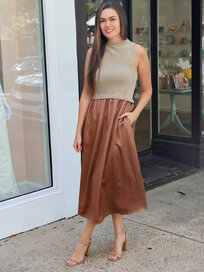 The Gwenyth Dress features a straight silhouette with a midi length and a discreet back slit, providing ease of movement and comfort. Its short sleeves and round neckline make it suitable for casual wear or elevated occasions like a date night.