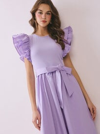 A printed babydoll mini dress featuring a ruffled mock neckline and short puff sleeves with elastic cuffs. Designed with a button-front placket and a relaxed, tiered silhouette. Finished with a softly flared hem for an effortless. 80% Polyester, 20% Cotto