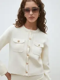 Off-white jacket with a round neck and front button closure with patterned buttons. Contrasting navy and red trim on the collar, placket, and hem. Includes two decorative front pockets. Cuffs finished with a two-tone ruffle. 65% Viscose 35% Nylon