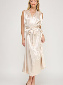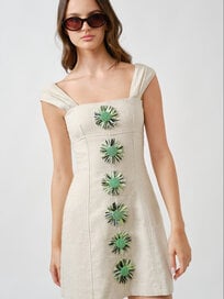 Featured in a beautiful Mystic Green color, this dress is crafted from a fabric that drapes beautifully. The defining feature is the accent straps, which are detailed with a floral accent, adding a unique, feminine touch to the simple spaghetti straps.