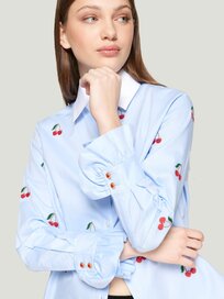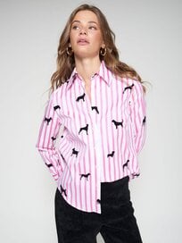 Button-up shirt featuring vertical pink and white stripes with black flocked dog silhouettes across the entire surface. Straight cut with a classic collar and visible front button closure. Buttoned cuffs and slightly rounded hem.Soft 100% cotton fabric.