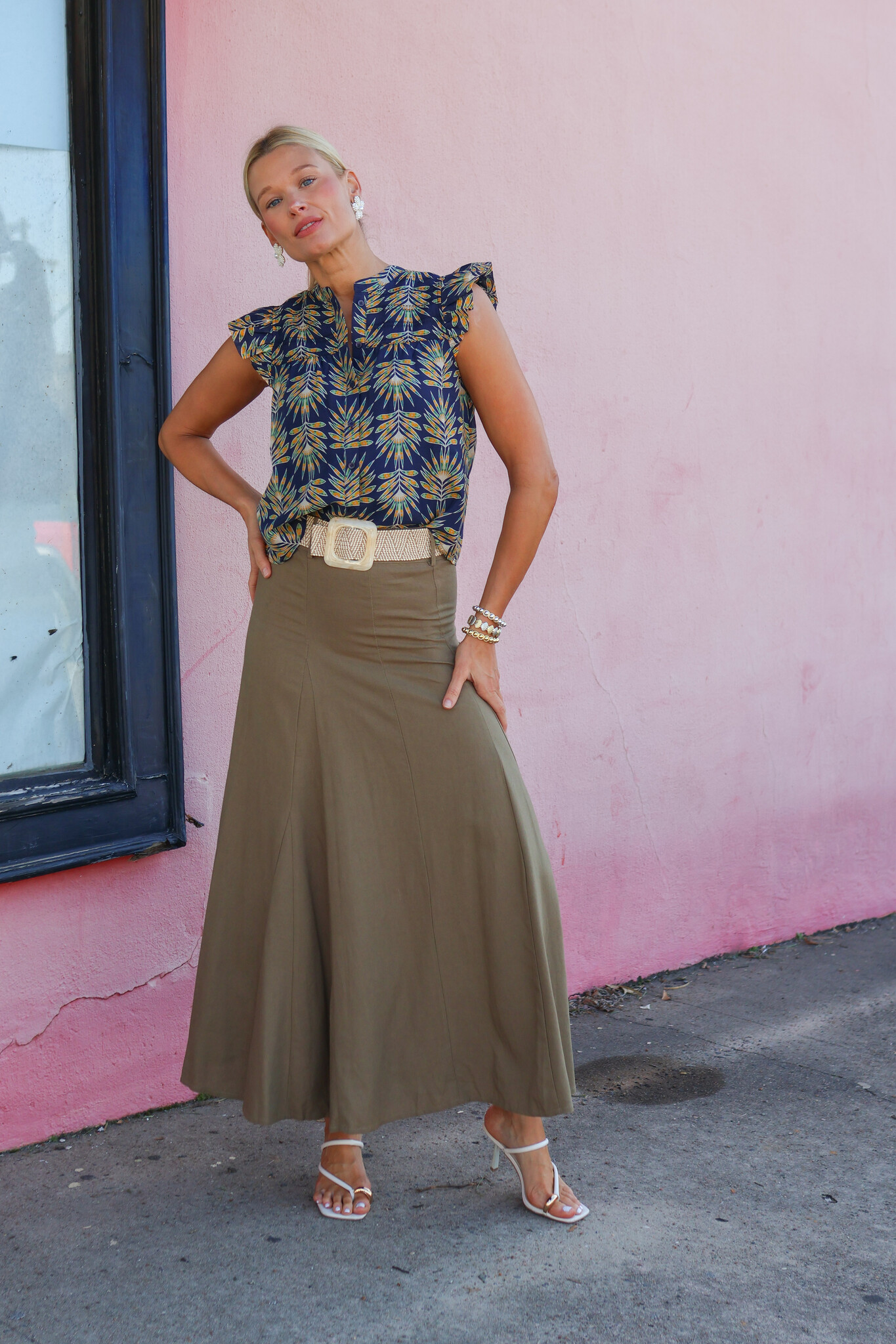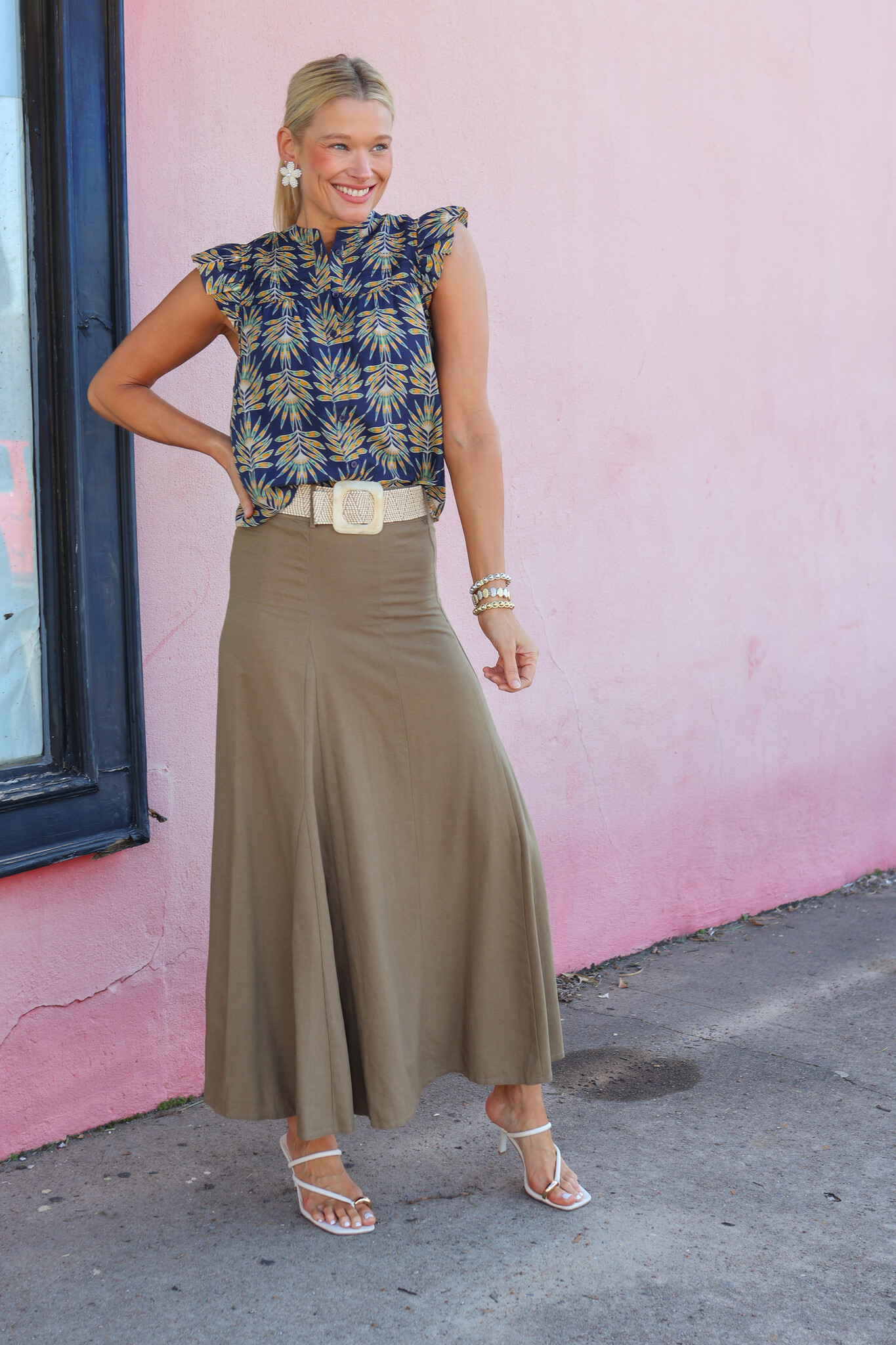 Midi skirt with belt loops. Features subtle paneling that creates a flared A-line silhouette and adds movement. Invisible center-back zipper and a detachable elasticized raffia belt for a relaxed, summery touch. Made from a breathable linen-blend fabric.