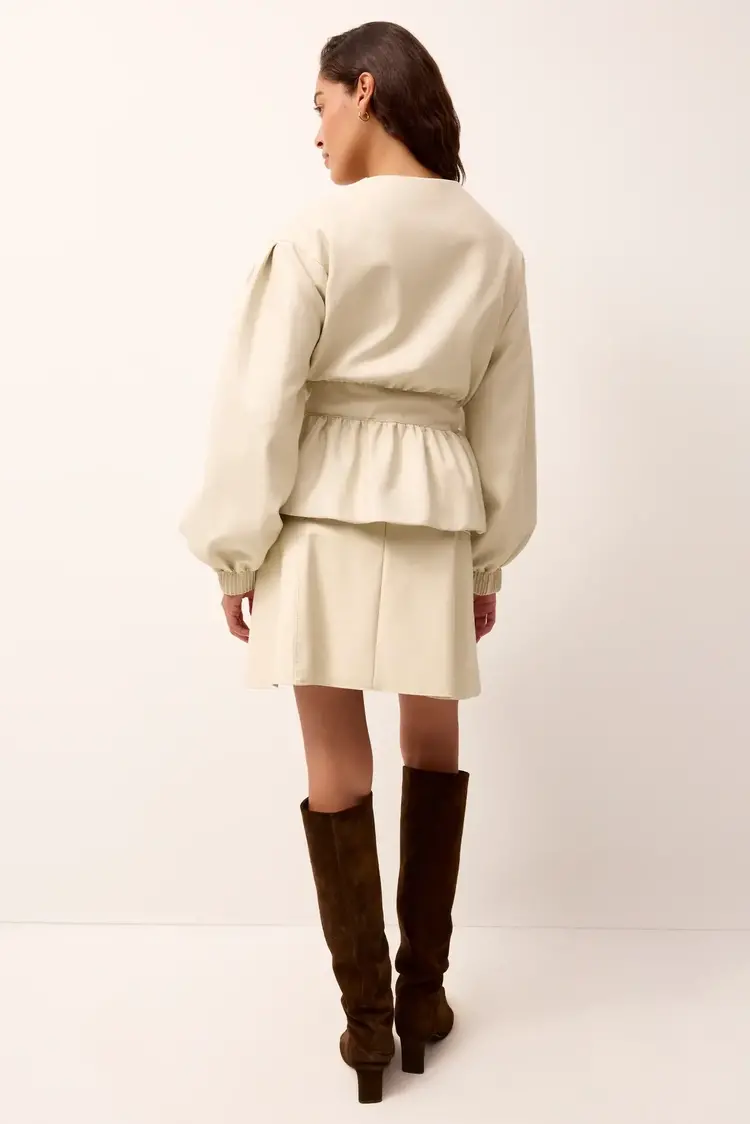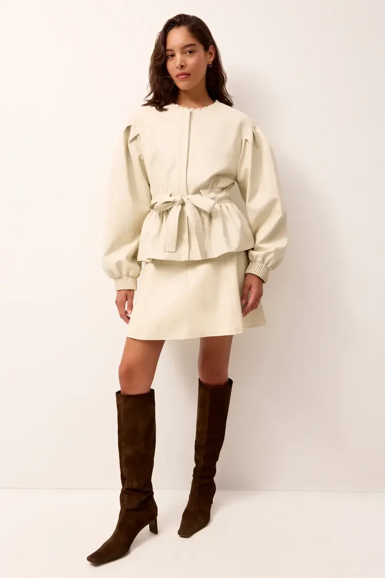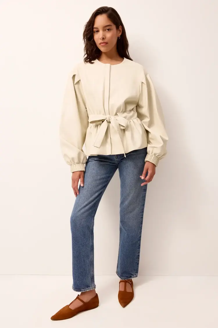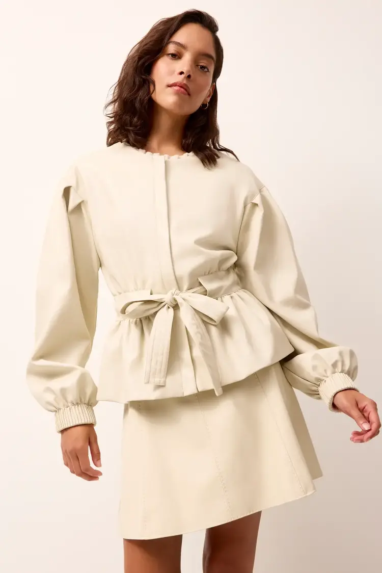 • A vegan leather jacket with plenty of attitude, the Coco exhibits femininity thanks to quilted and pleated details that will keep you warm in style. A tie at the wast creates cinching along with a more personalized fit, while pleated cuffs adds elegance.