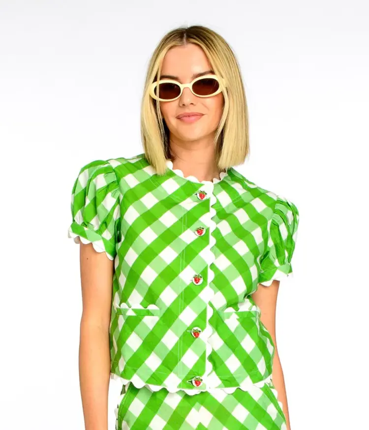 Our new button front Coco Top is a darling silhouette that can also be worn as a jacket. With puffed sleeves, ric rac trim, and strawberry embroidered buttons, she is the sweetest wardrobe addition for the summer season.