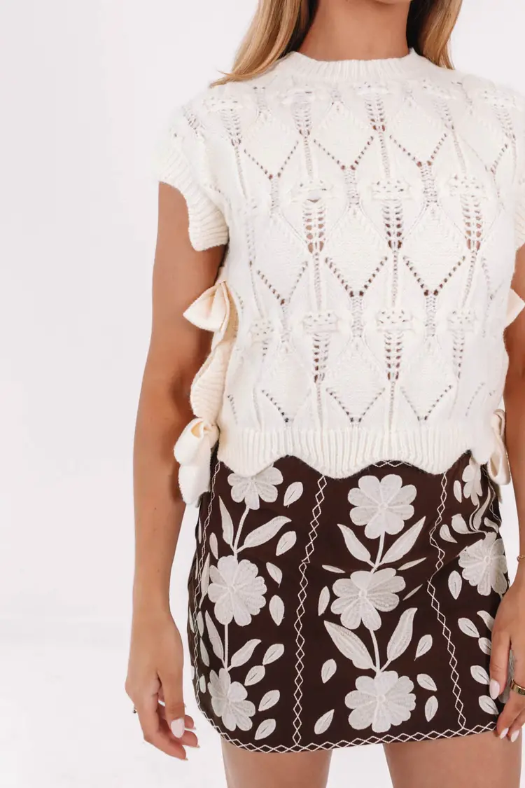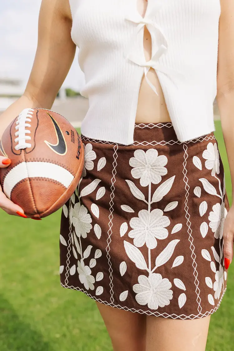 • Serve some serious retro vibes in this embroidered floral mini skirt that’s as sweet as your campus coffee shop crush. The rich chocolate brown paired with bold cream stitching makes it a standout for study dates or stadium seats.