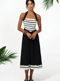 The textured ribbon bodice features bold halter straps and a flattering neckline that frames the shoulders just right. A fitted waist flows into an airy A-line skirt, finished with matching ribbon trim that ties the whole look together.