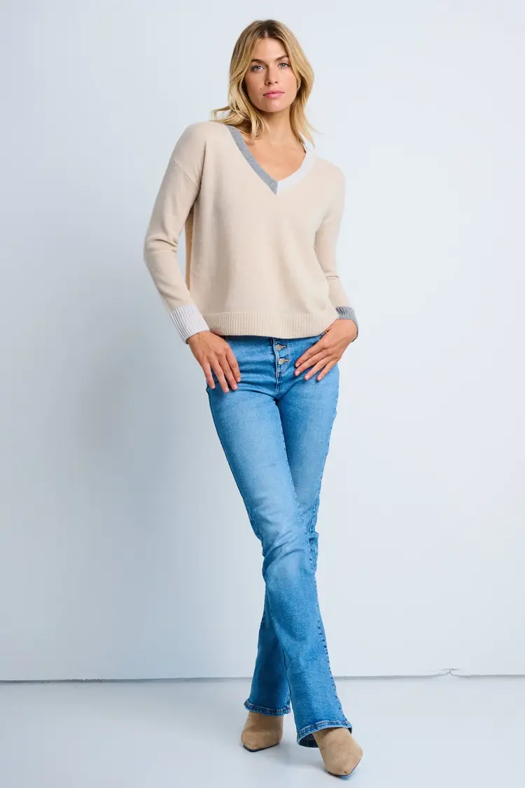 The Color Wheel sweater reimagines the classic V-neck with artful colorblocking at the cuffs and back. Knit in 100% Cashmere, this relaxed silhouette features drop shoulders and refined ribbed finishes for a wearable, everyday statement.