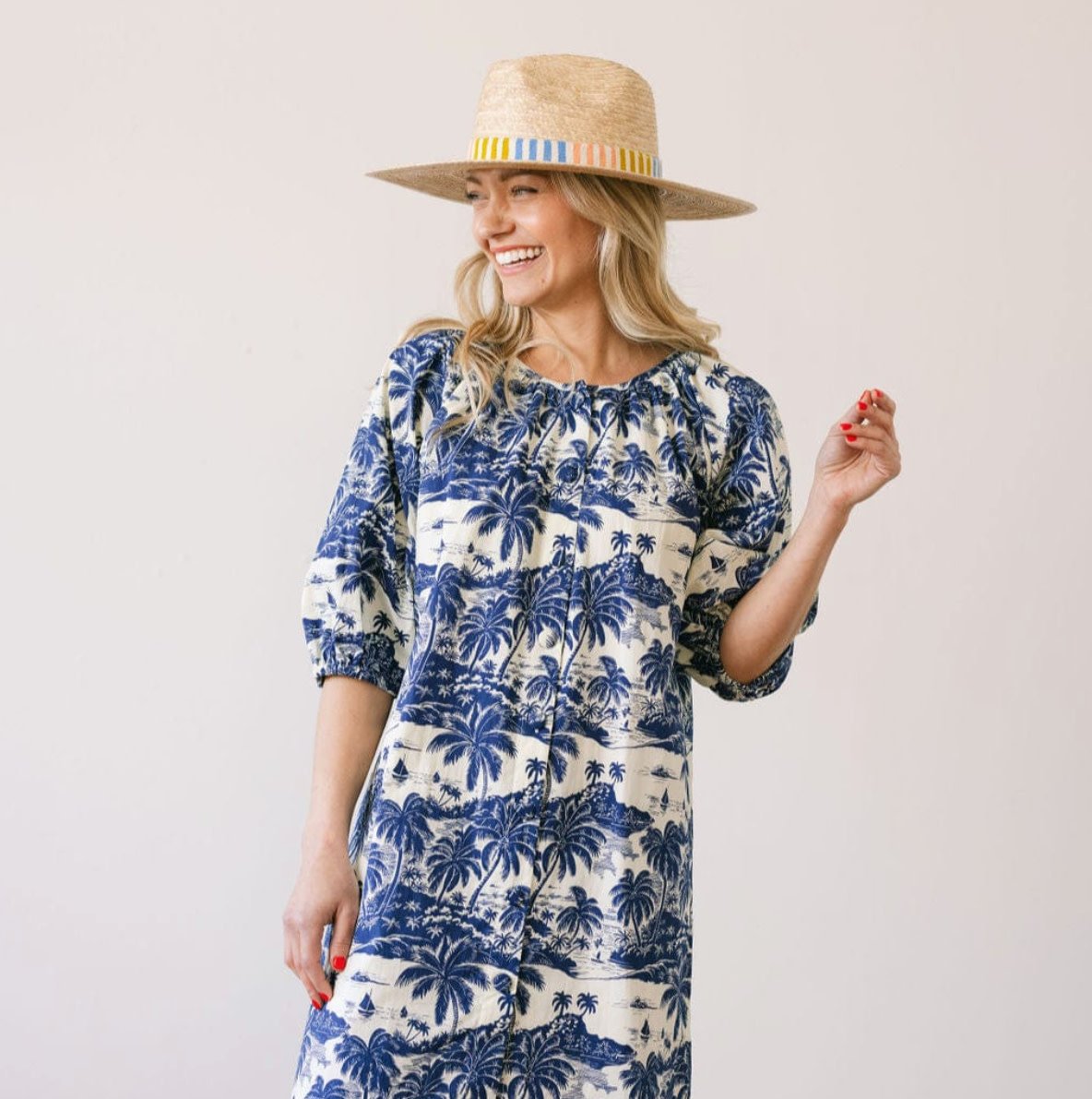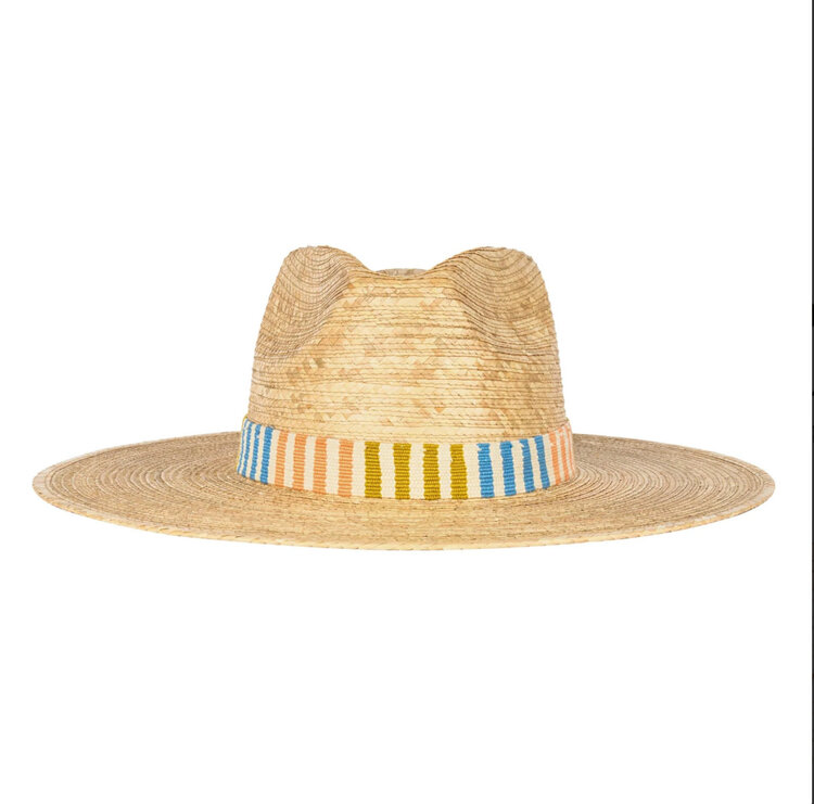 • The Colorful Daydreamer Palm Hat features a neutral cotton band with pink, yellow, and blue stripes and is a part of our sustainable, fair trade hat collection and graded at the highest UPF rating.