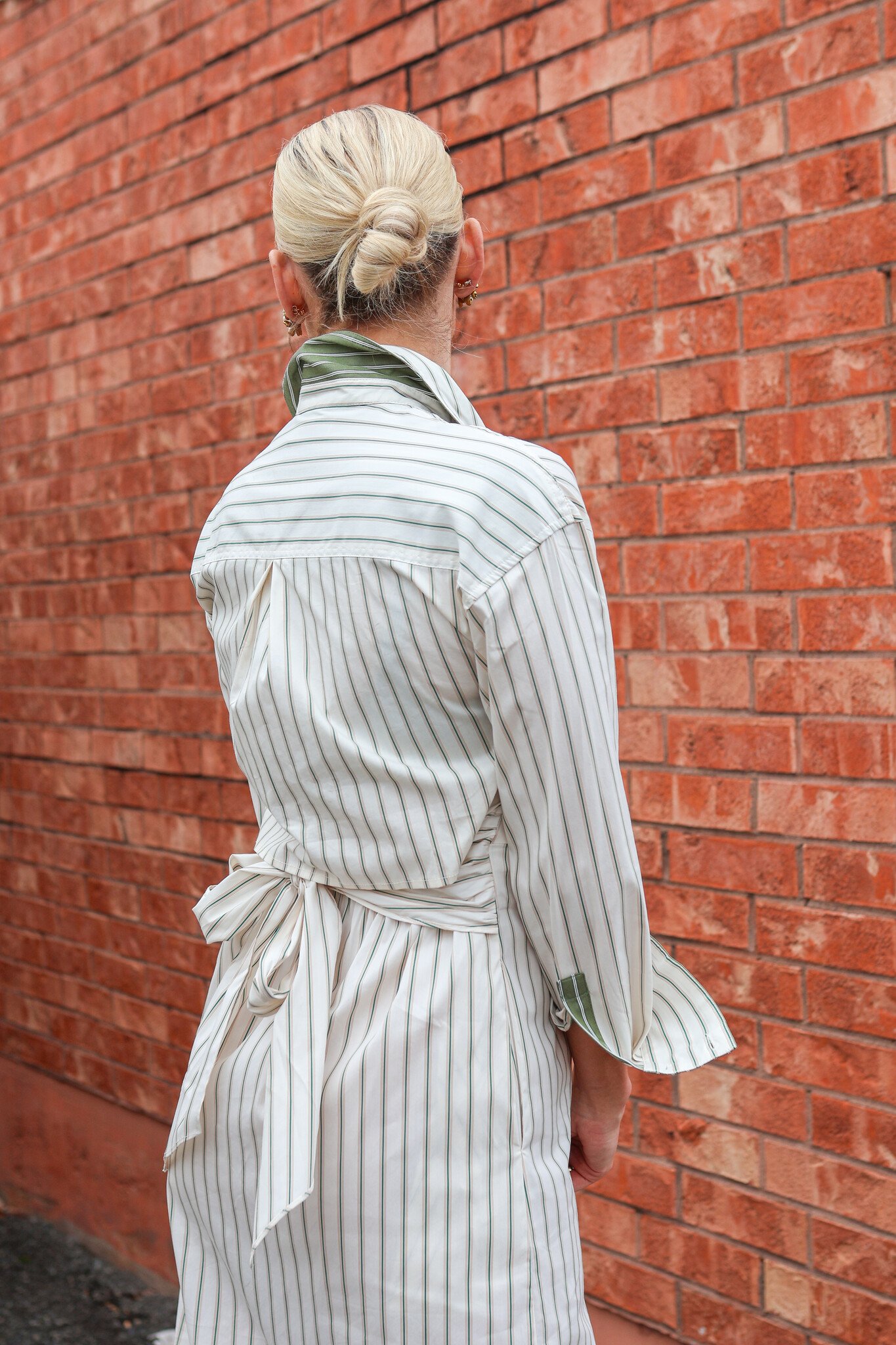 It features the structure of a traditional shirt dress, complete with a collar and likely a button-front closure. The defining feature is the unexpected open back detail, which creates a beautiful element of surprise and elegance.