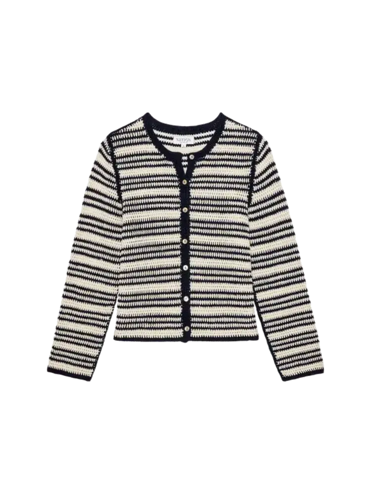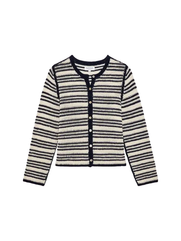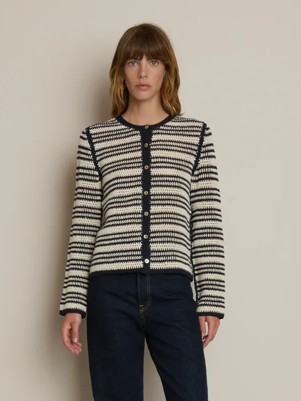 • Made entirely by hand from 100% cotton, the Courtney Crochet Cardigan features a boxy, cropped fit with retro graphic appeal and timeless texture. Shell buttons catch the light—whether worn partially fastened or layered open.