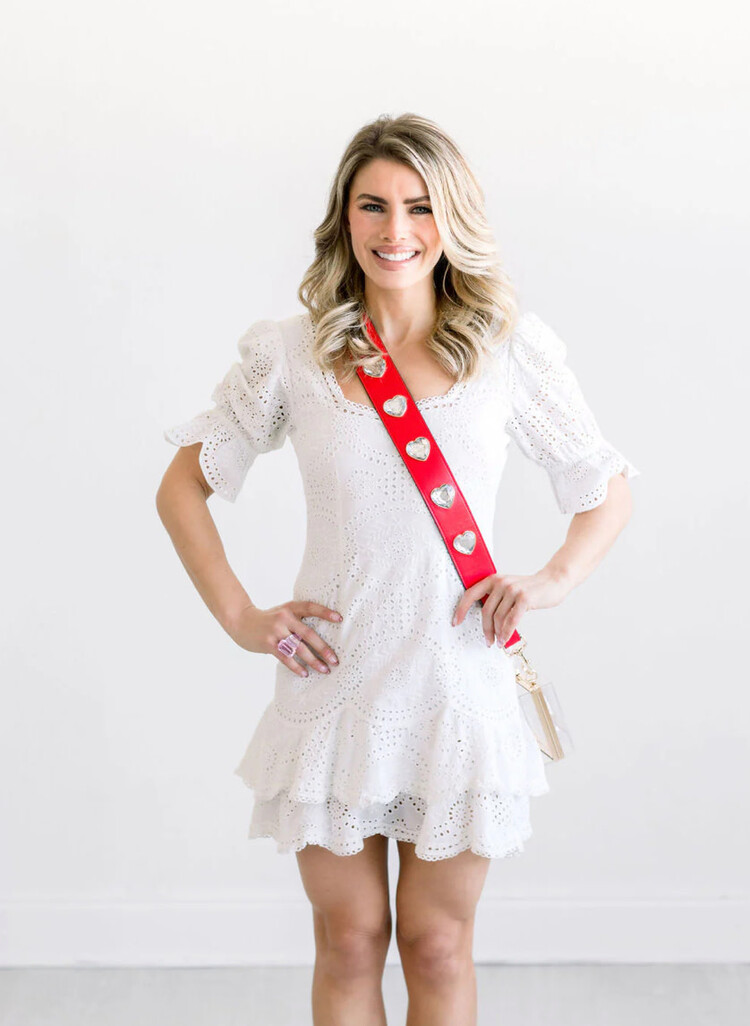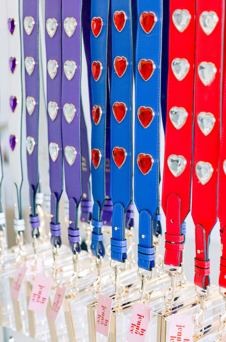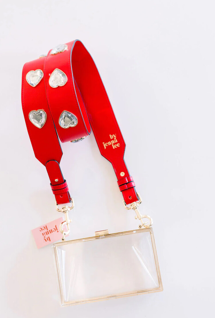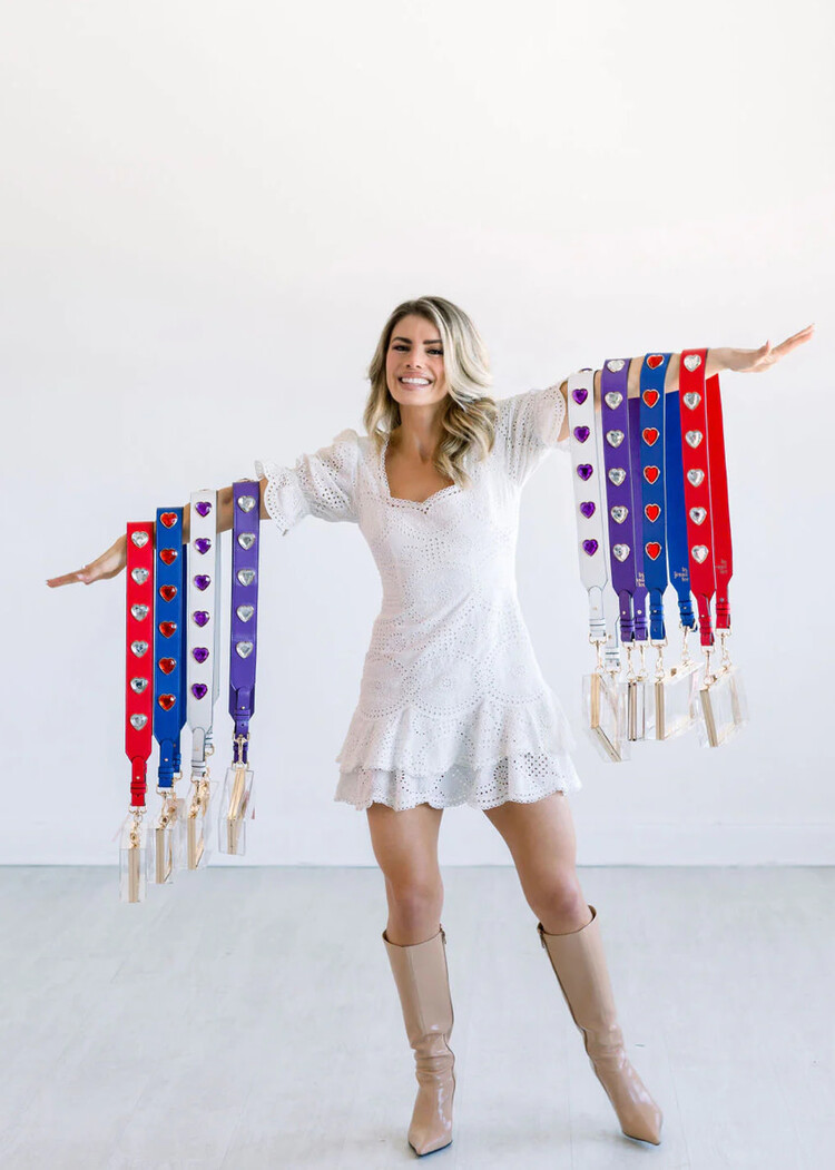 Adjustable crossbody purse straps designed to spruce up your game day and/or stadium event look! Leather purse straps embellished with crystal hearts & gold hardware.
