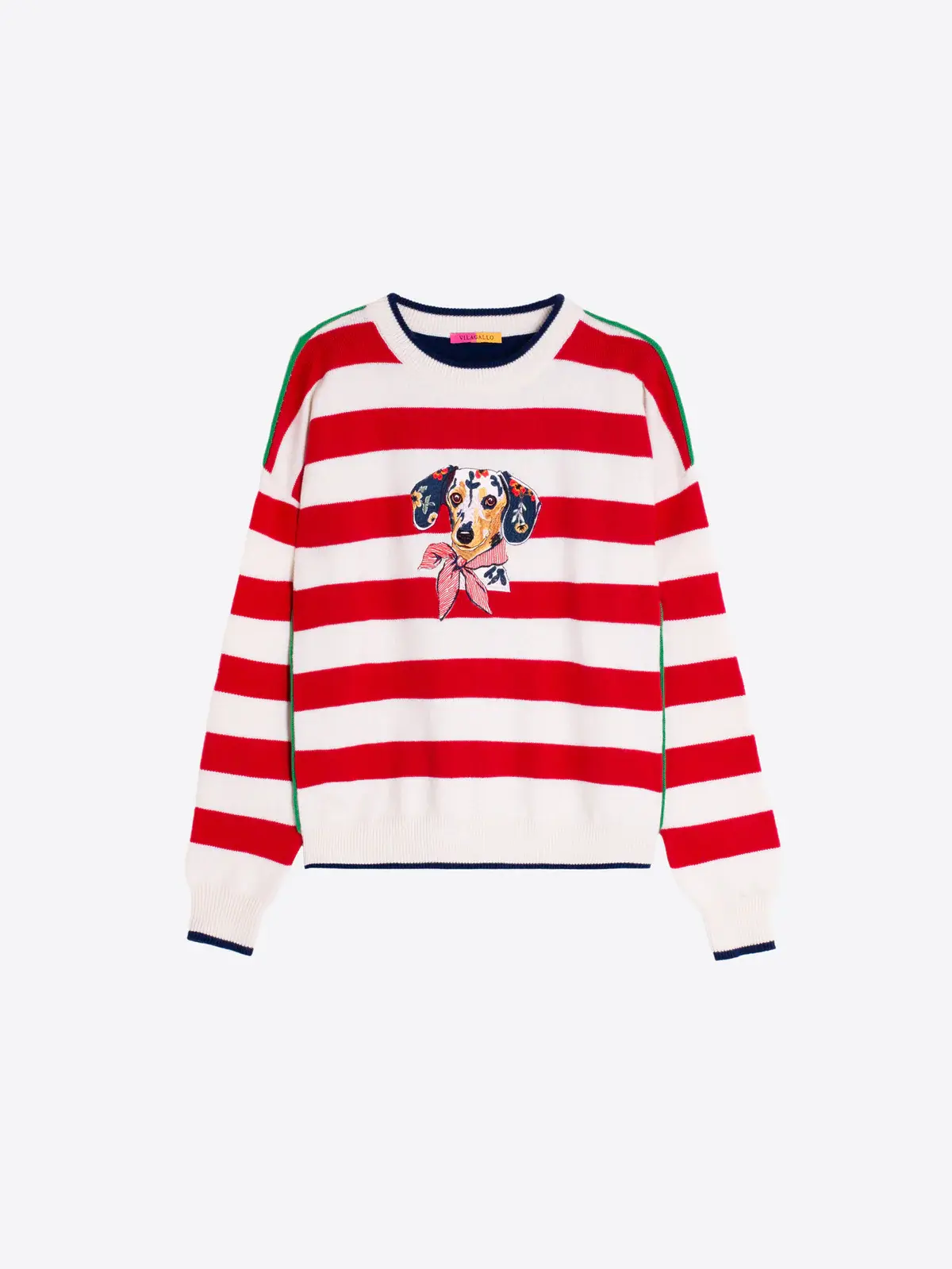 • Red and ecru striped sweater with a central dachshund embroidery. Round neck, green details on the shoulders, and ribbed cuffs and hem. Straight silhouette. 60% COTTON 40% ACRYLIC