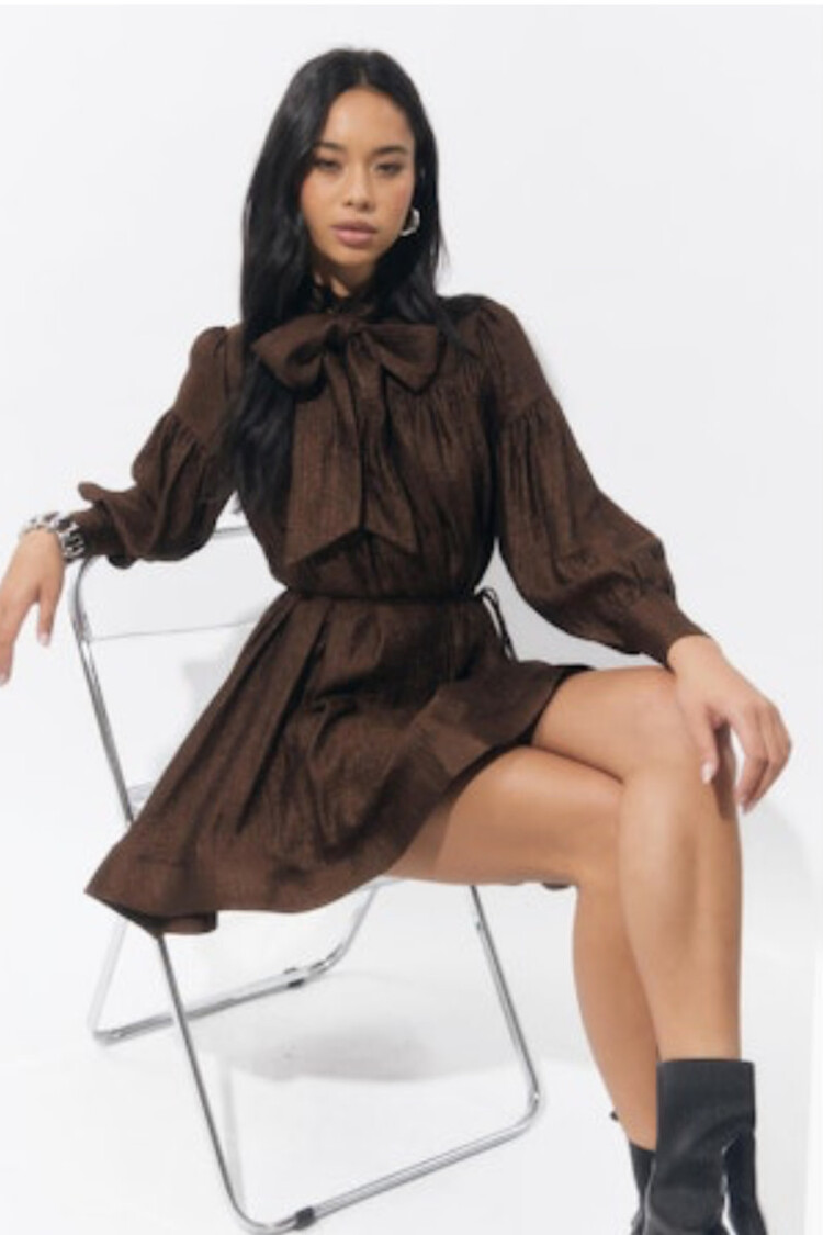 • This charming party dress features elegant full sleeves and a delightful bow tied at the neckline, perfect for adding a touch of sweetness to any occasion.