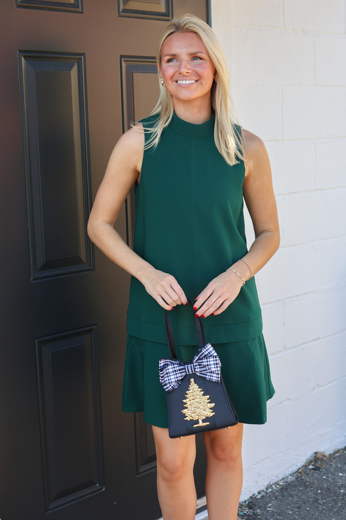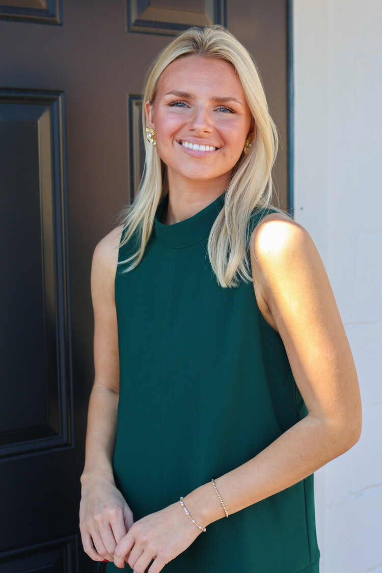 A sleeveless shift mini dress featuring a mock neckline. Designed with a clean front seam and a layered hem detail that adds subtle structure and movement. Finished with a concealed back zipper closure.