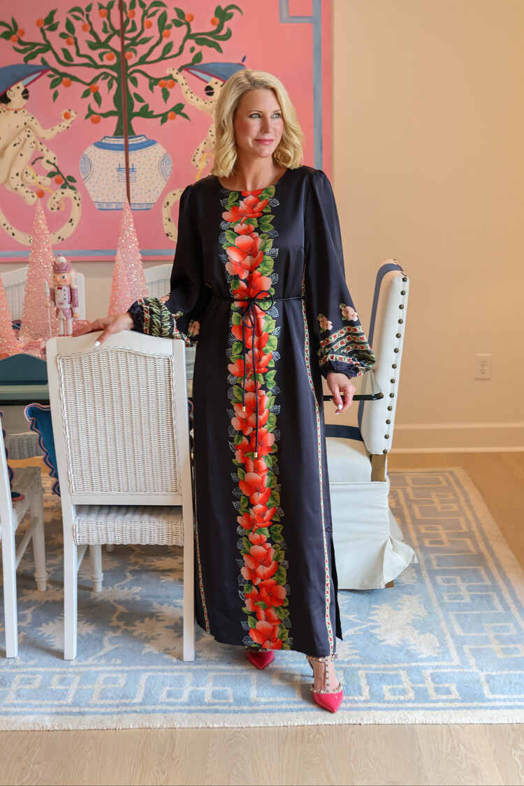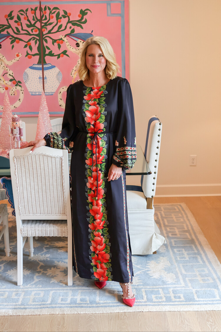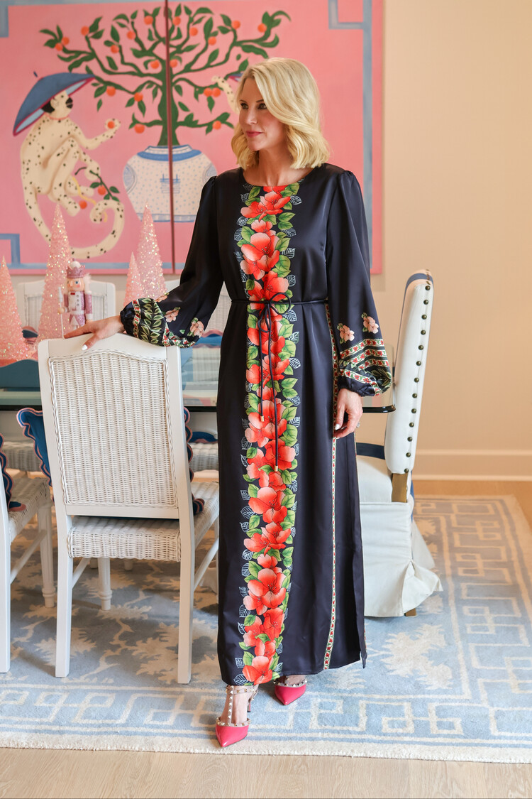 Dawn is a relaxed maxi dress, elevated with a stunning Holiday print, balloon sleeves, and an optional cord belt. She is one of our favorite picks for this time of year, perfect for staying stylish and comfortable throughout the Holiday season.