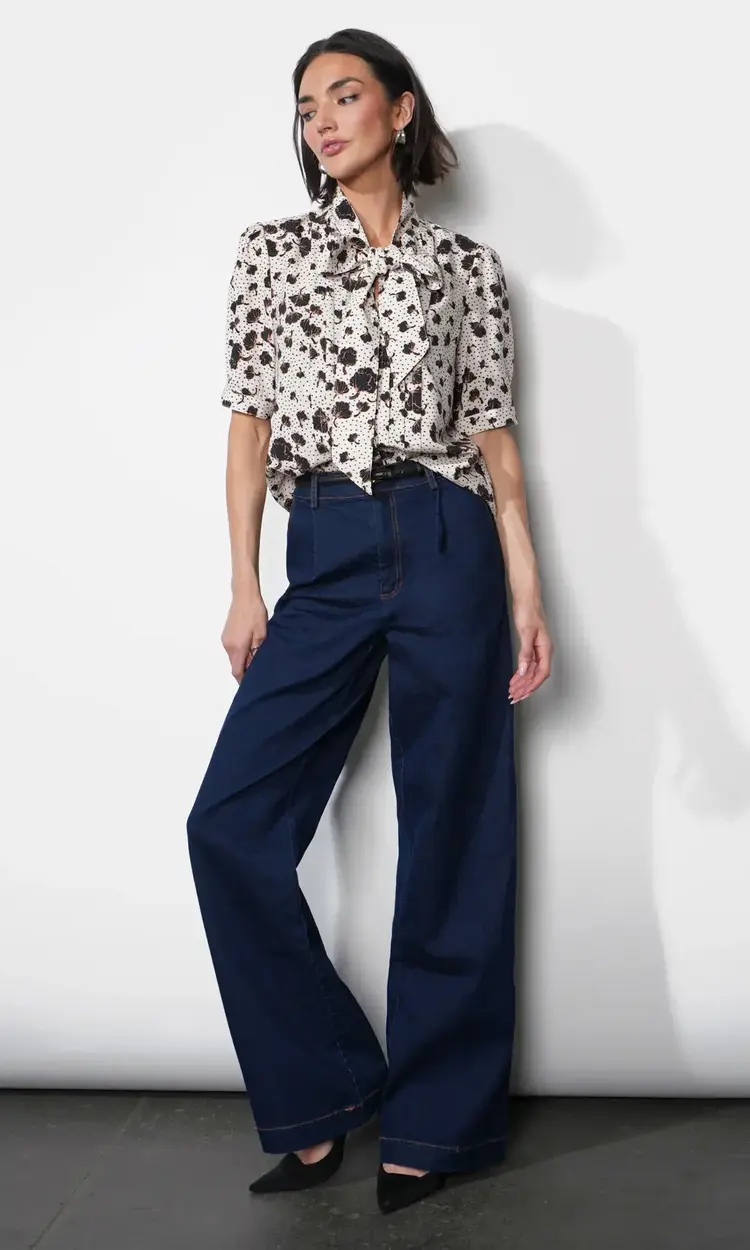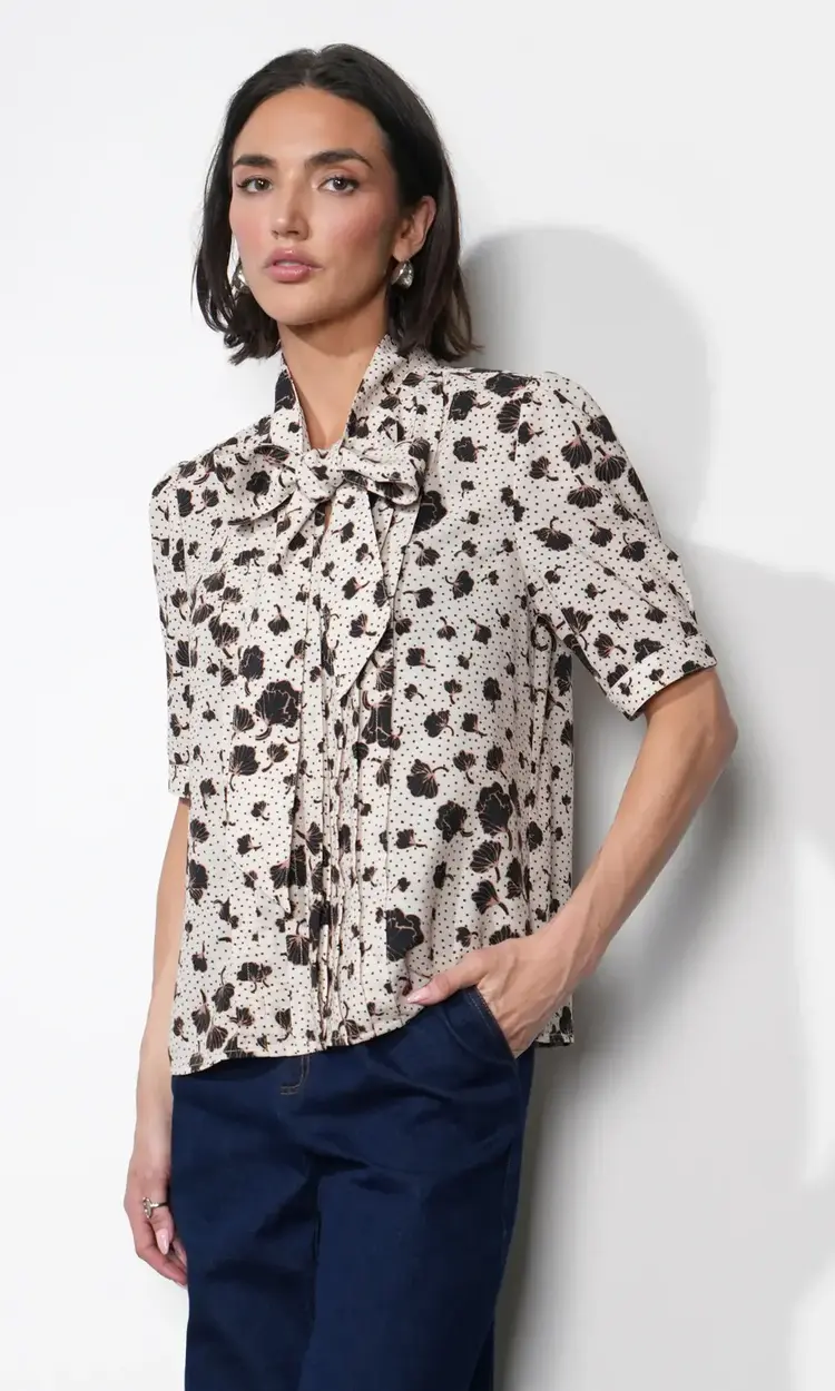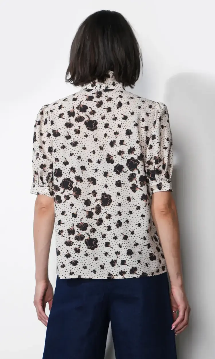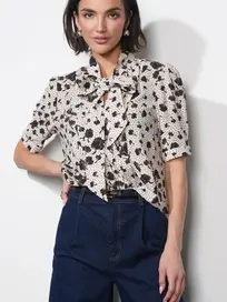• It features distinct design elements: elegant short puff sleeves that add volume to the shoulders and a sophisticated scarf neckline that can be tied into a bow or left draped.